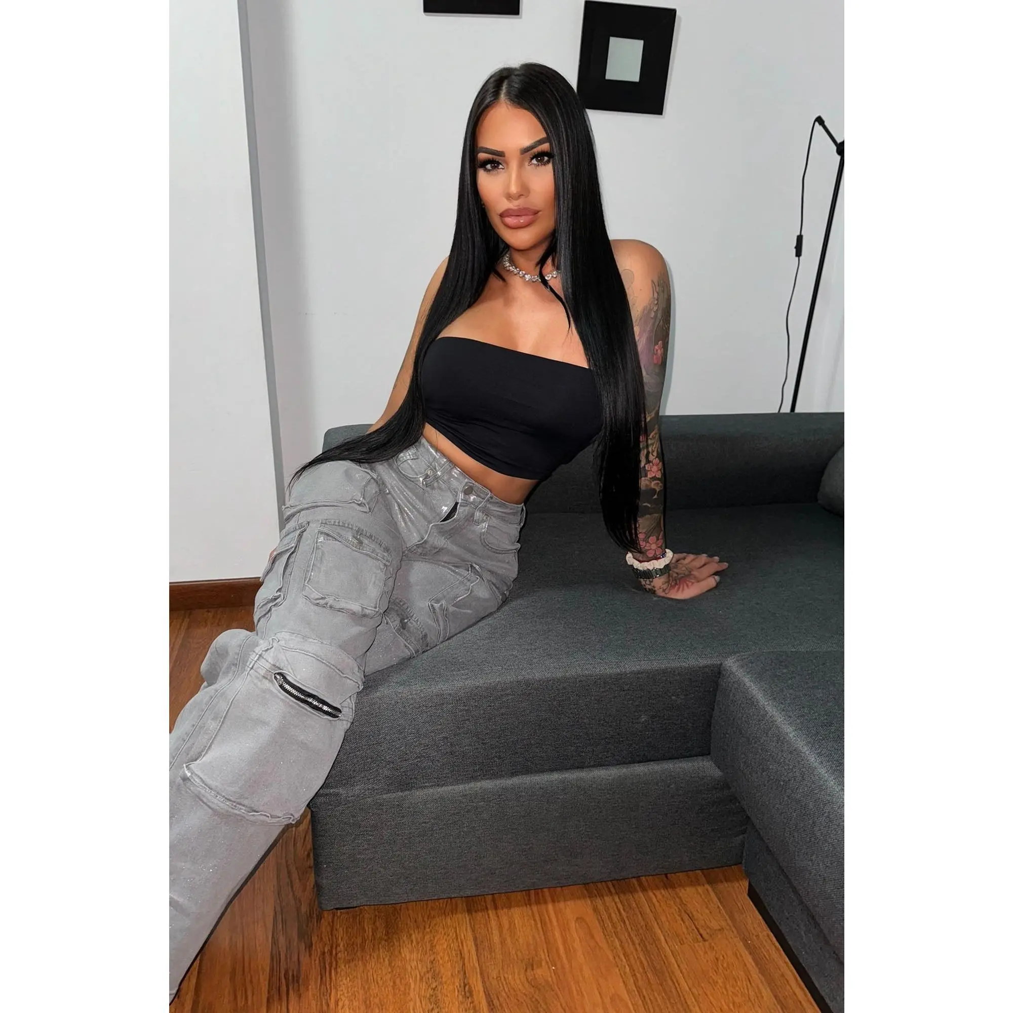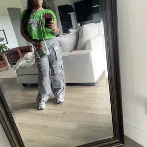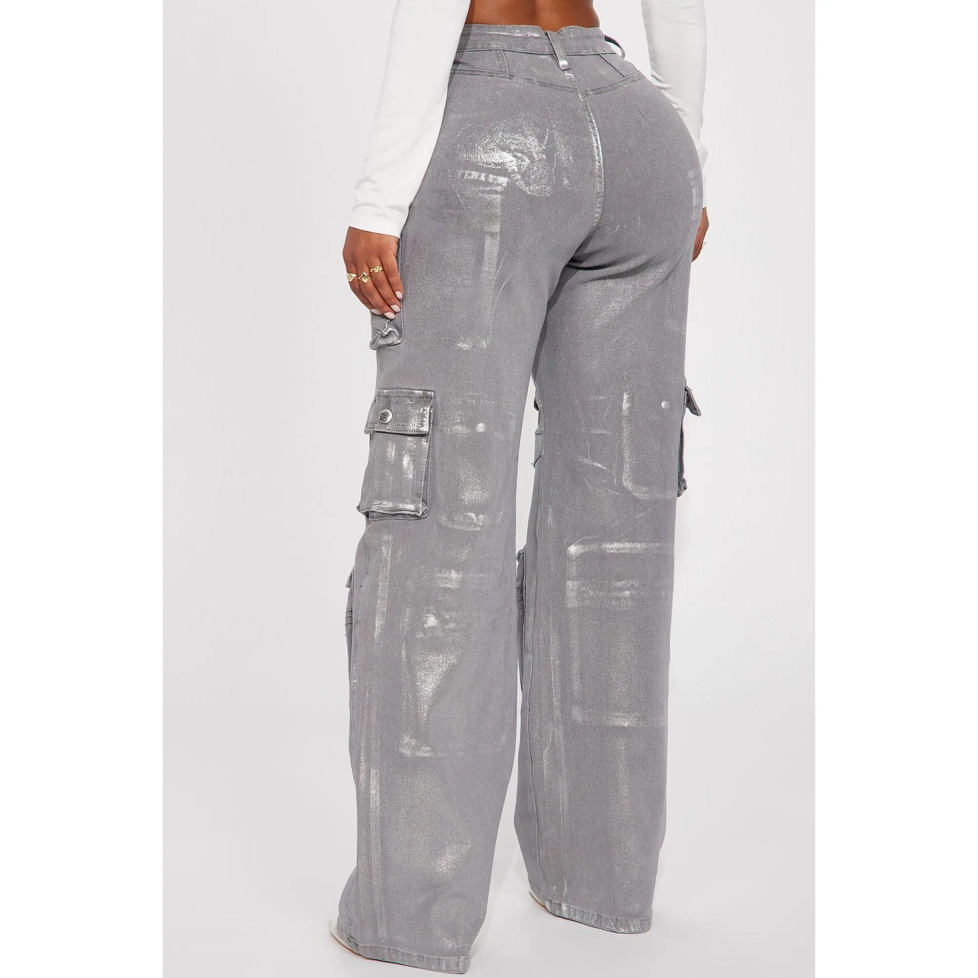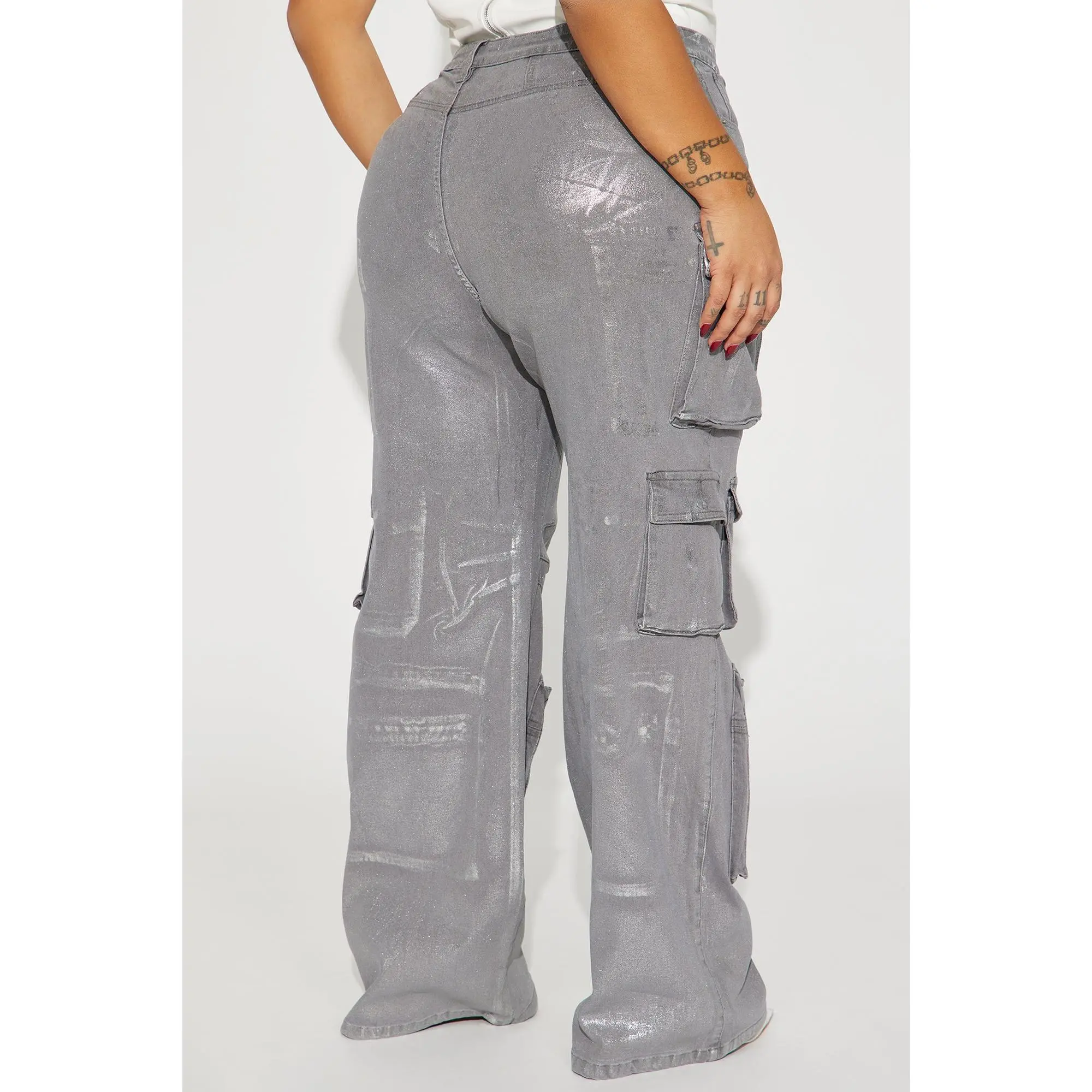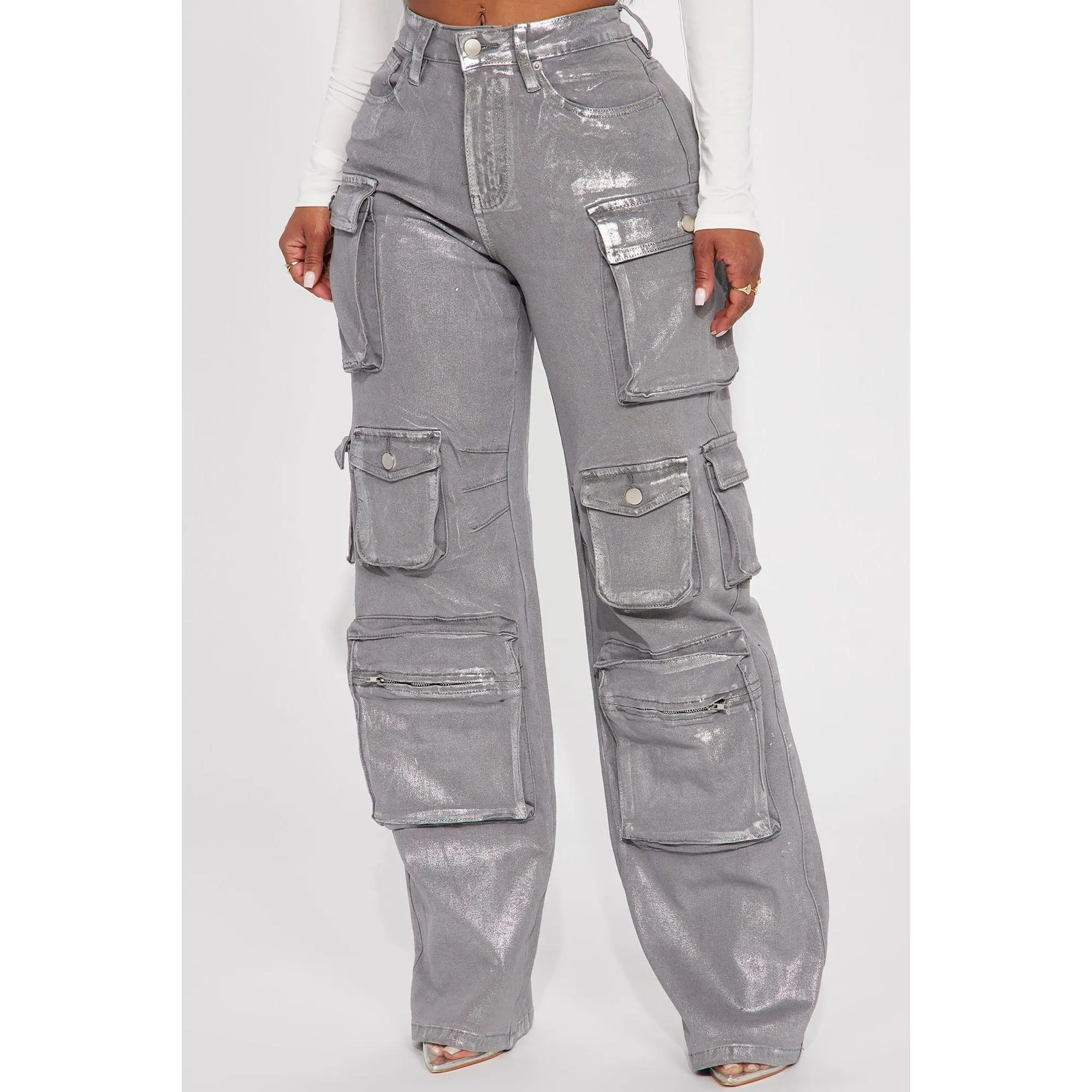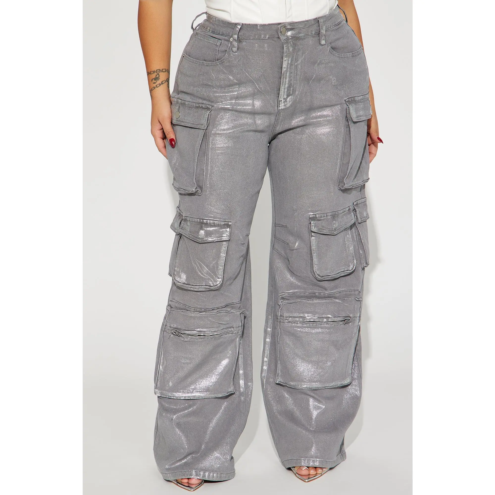 I love, love, love these cargo jeans. They have 5 pockets on each leg, the one at the bottom has a zipper. I am 5'10, 220lbs and I got a 14 plus. They do have a good amount of stretch so I could have sized down. Very tall girl friendly, they drag a little bit on me which is perfect. Excellent buy..