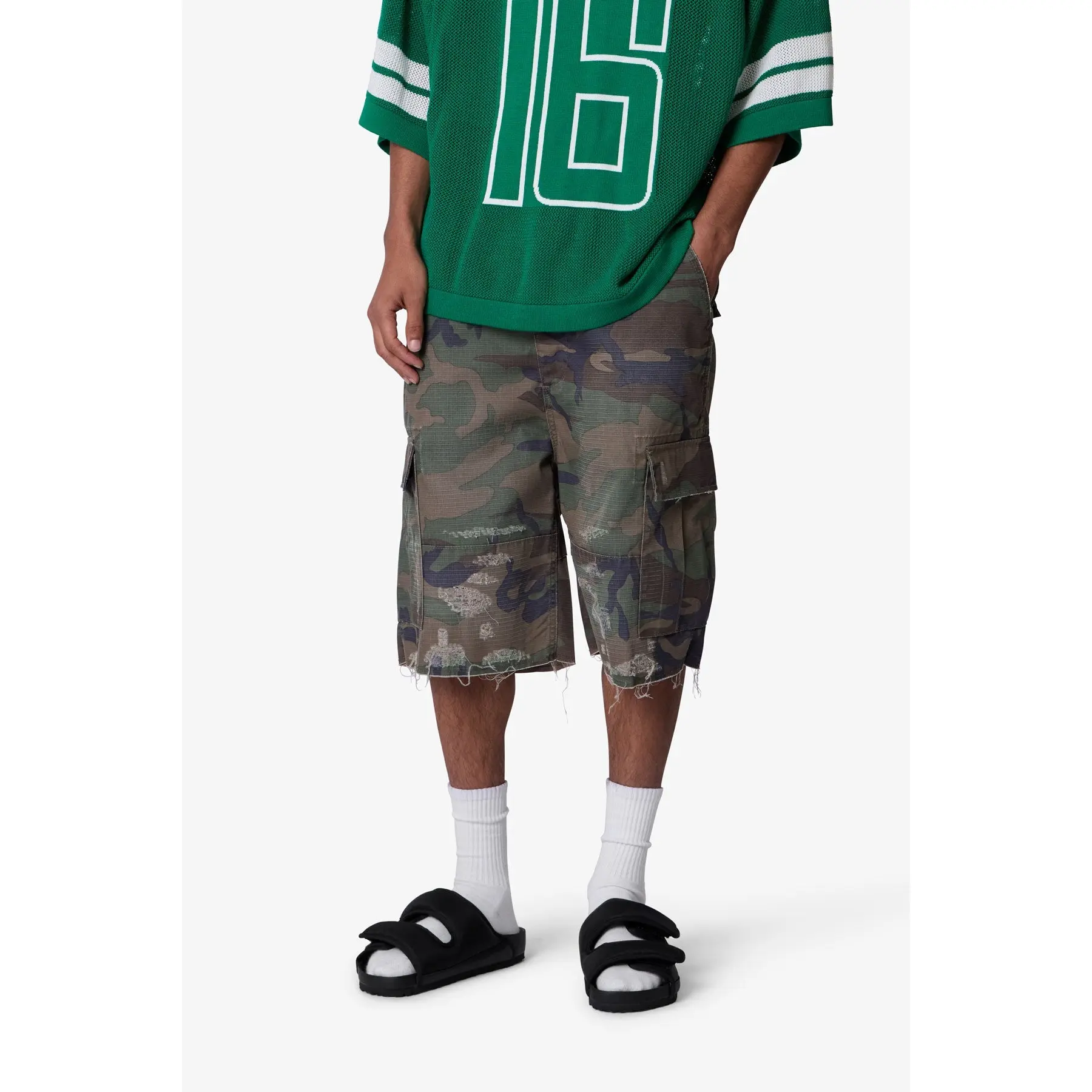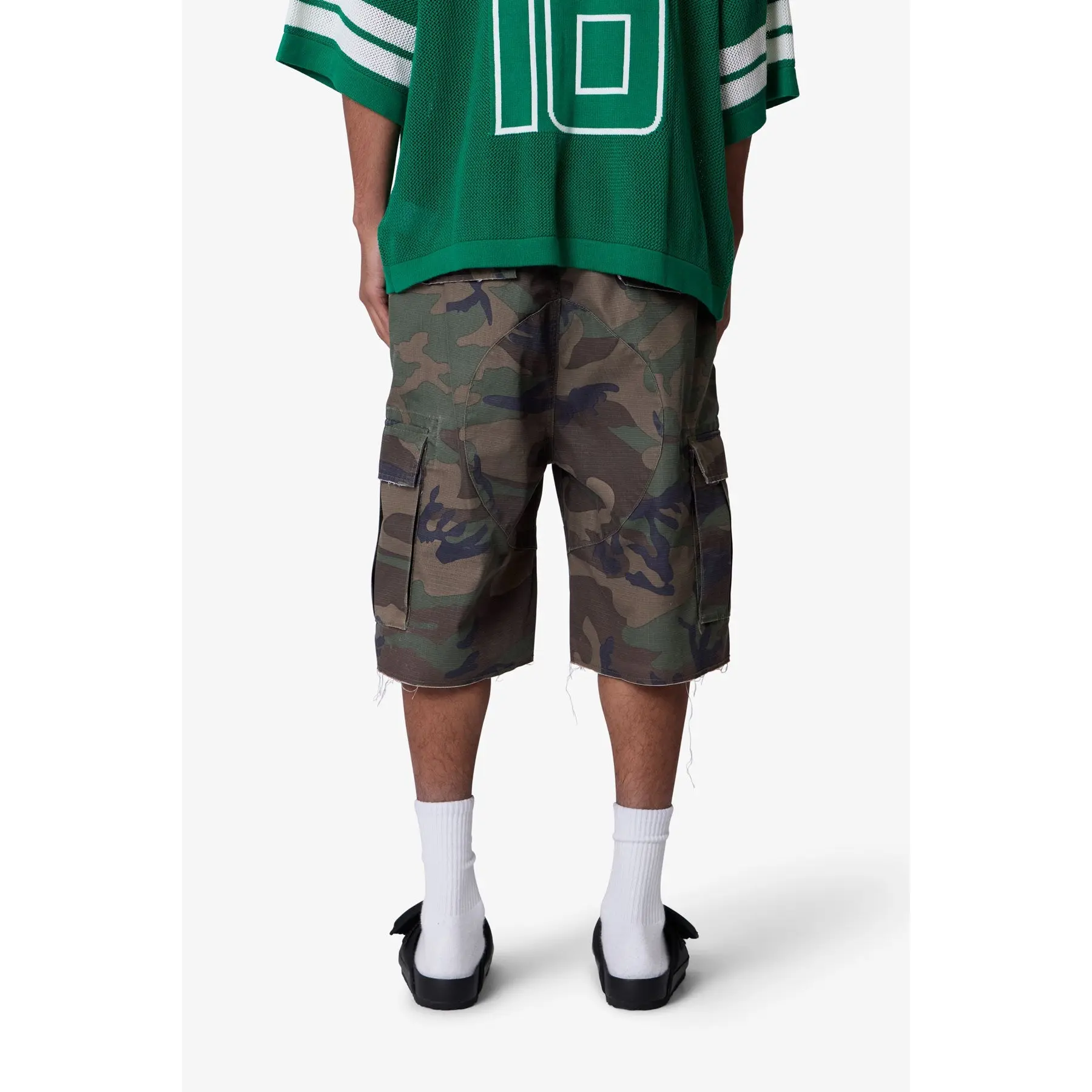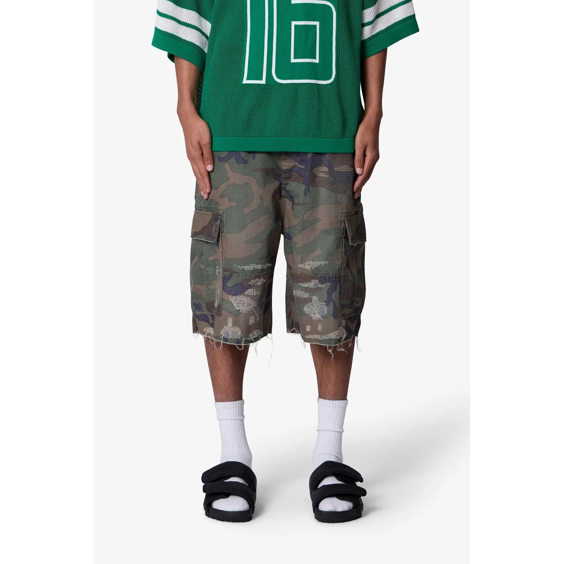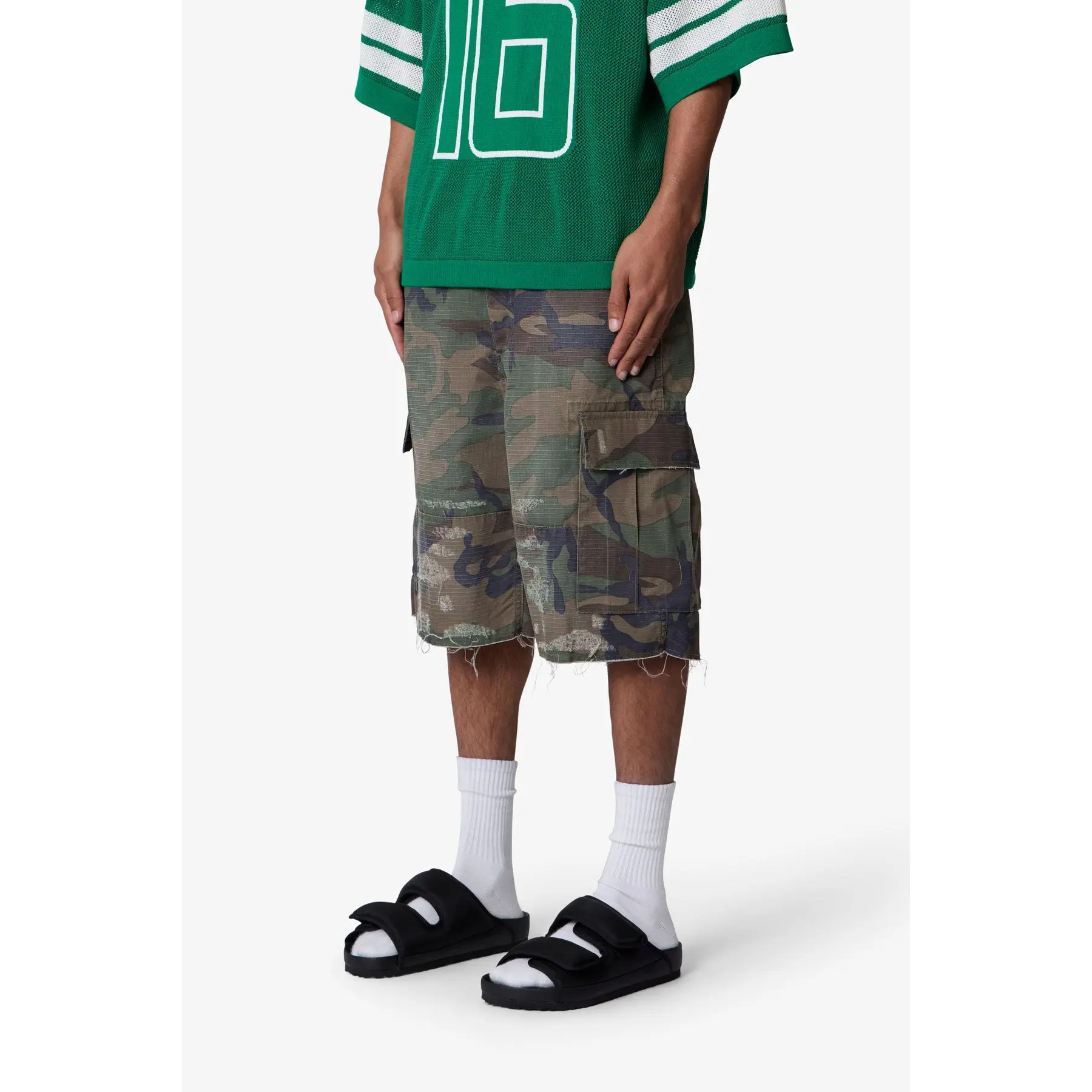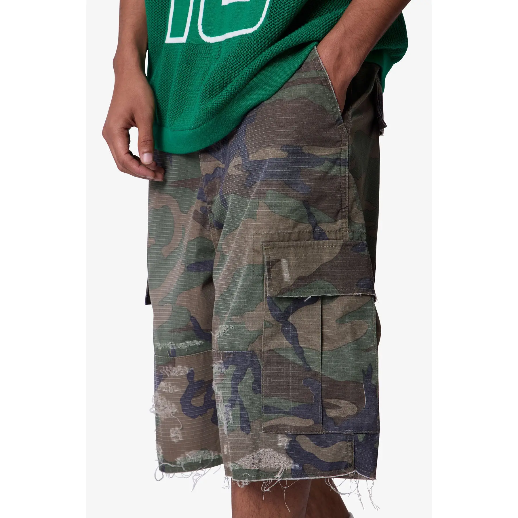 Constructed from a cotton-poly ripstop blend with a vintage wash, these shorts feature a baggy fit in a woodland camo print. Designed with heavy abrasion and faded detailing across the thighs, they include exposed threads at the raw cut hems for a deconstructed finish. Two large side cargo pockets with flap closures offer function and storage.