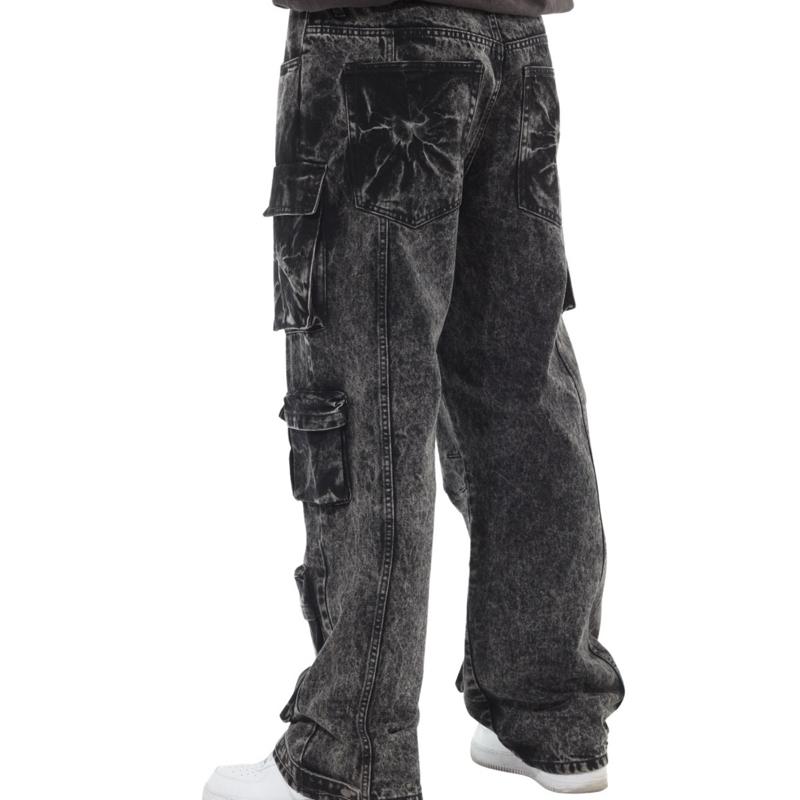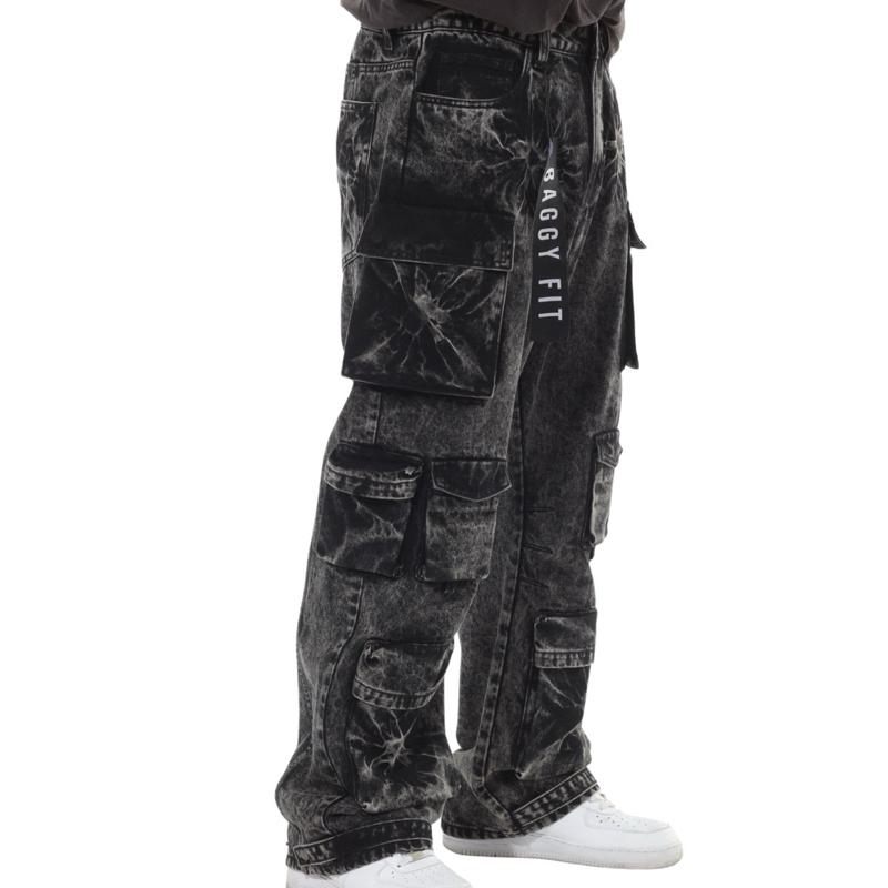 8 Pocket Black Acid Wash Baggy Fit Cargo Jeans for Men's Streetwear Fashion