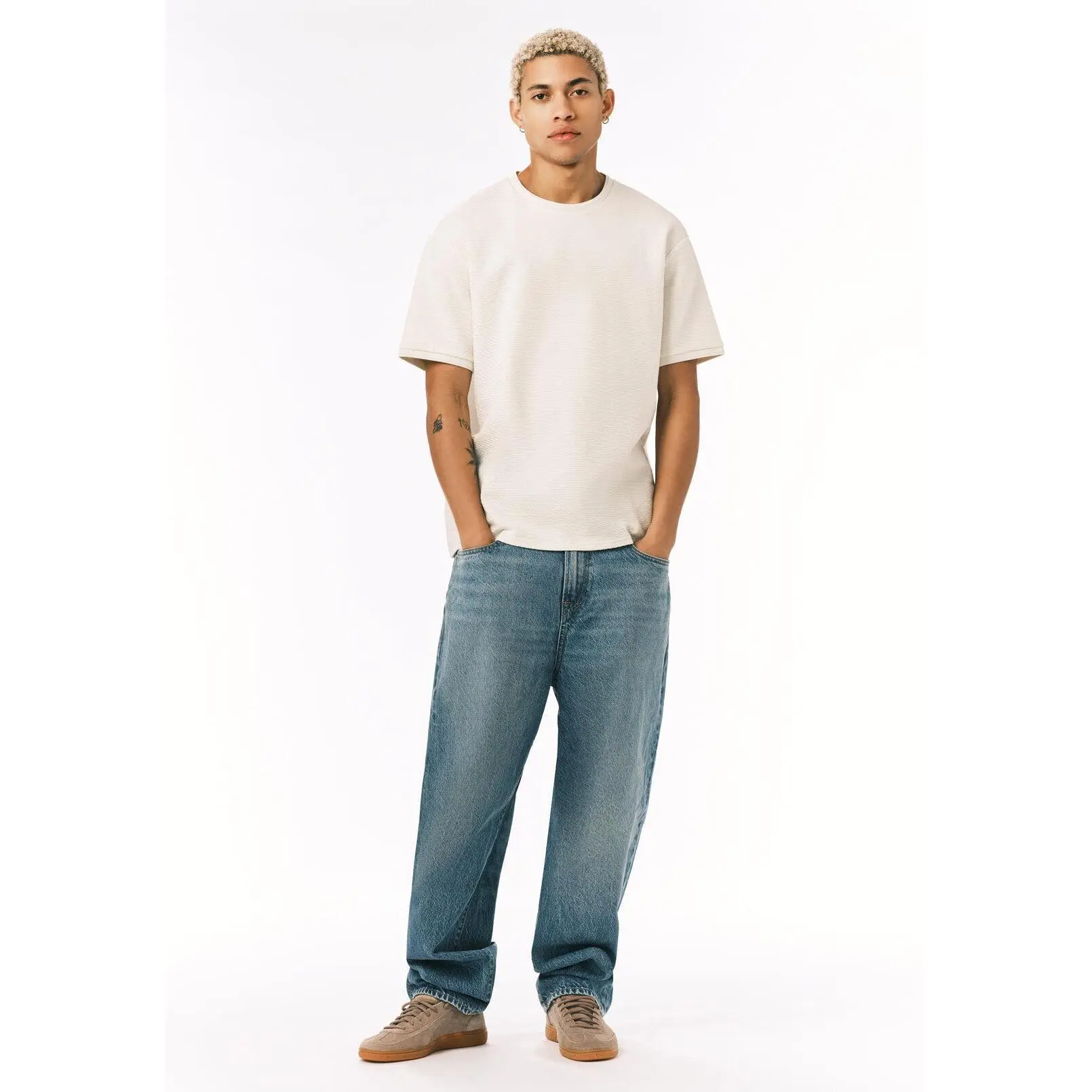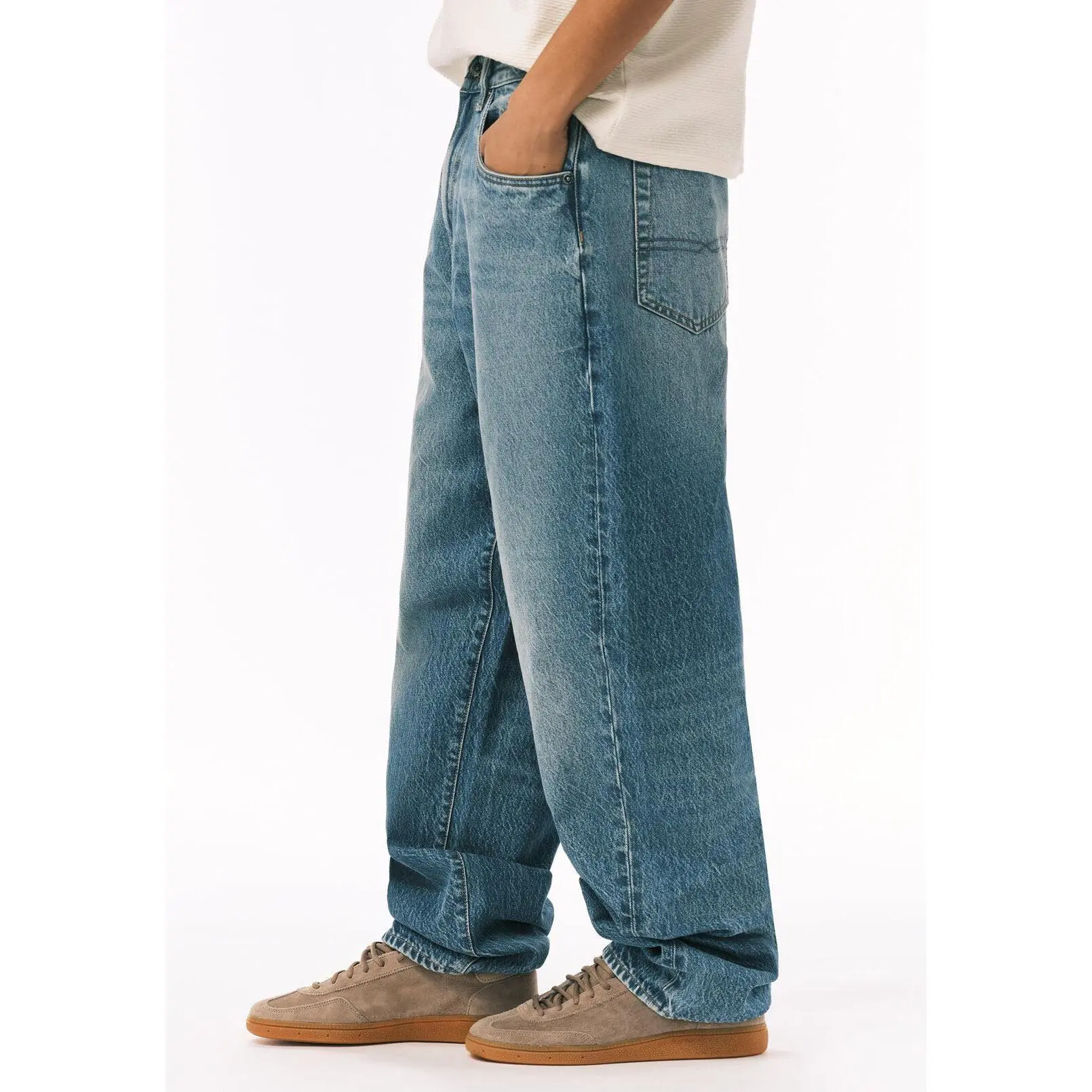 These Baggy Fit Mikey men’s jeans feature a relaxed fit with a light wash and subtle fading for a vintage-inspired look. Designed with a regular rise and classic five-pocket styling, the loose leg offers all-day comfort and a laid-back feel, perfect for casual everyday wear.