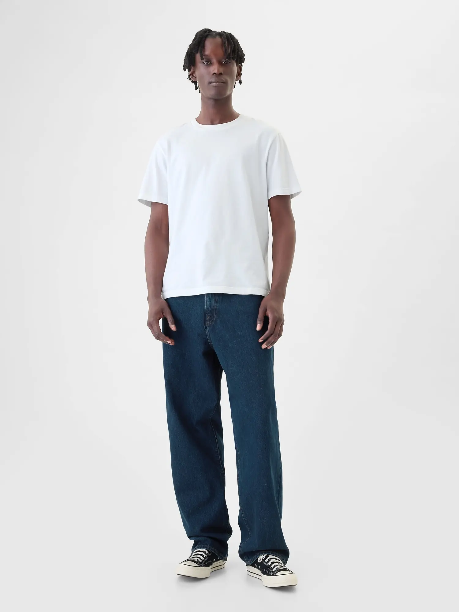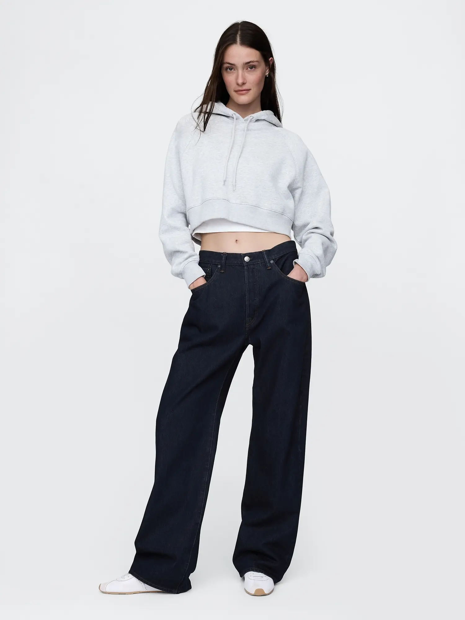 Our Mid Rise Jean has a 12.75″ (32 cm) rise. Sits below the waist with a longer rise. Baggy through the hip & thigh. Loose, slightly tapered leg. Longer inseam that stacks at the hem. 18″ (46 cm) leg opening. Models are 6′1″–6′2″ (185 cm–188 cm) with a 31″ (79 cm) waist & 32–33″ (81 cm–84 cm) inseam & are wearing Gap size 32 x 32.