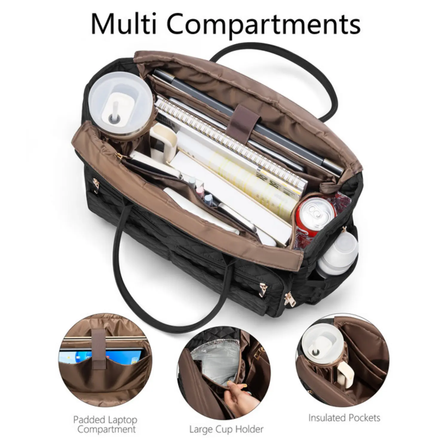 I am in love with this bag. I have so much room for all my work folders. I even have room to put my lunch in there. The insulated cup holder is so nice. I bring my coffee creamer to work and do not have to worry if I forget to put it in the fridge right away.