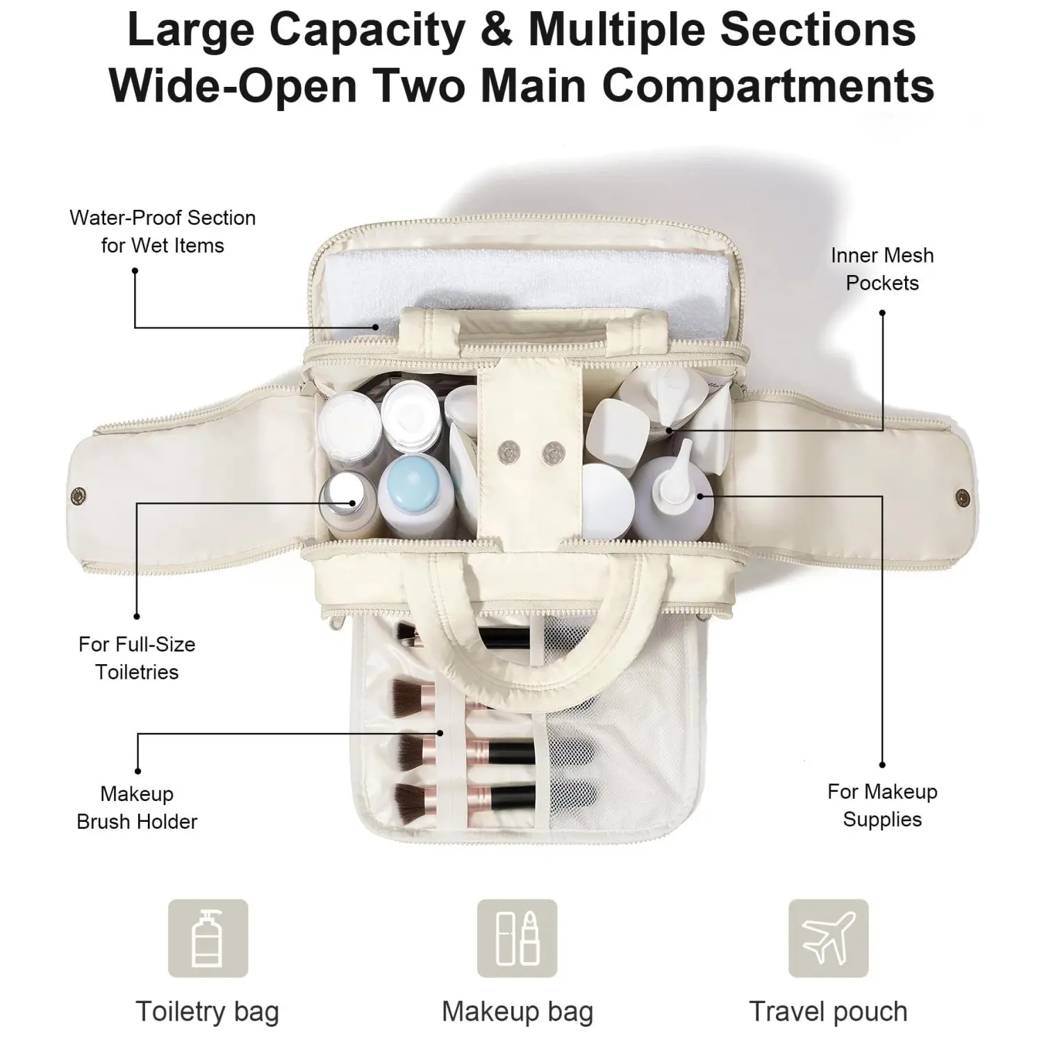 Travel Toiletry Bag: Holds shampoo, conditioner, skincare, toothbrush, toothpaste, and more.