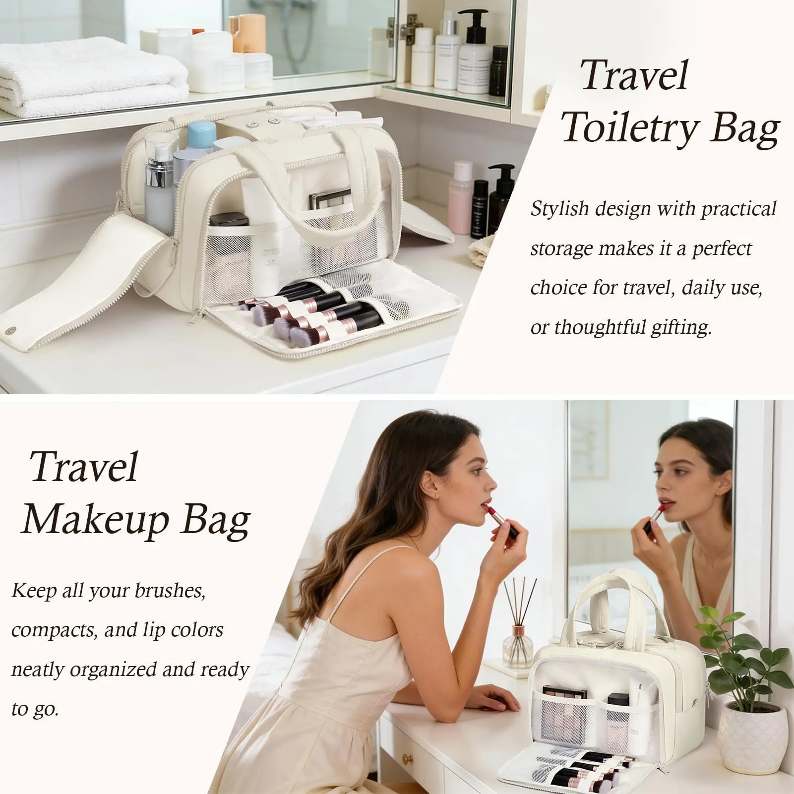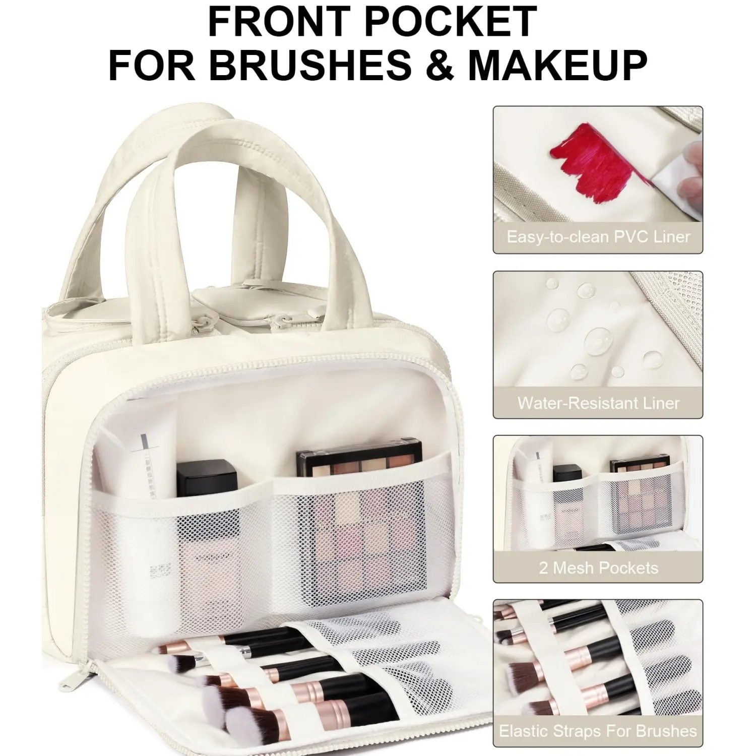 Multiple Compartments: 4 intelligently designed sections keep bottles, cosmetics, brushes, and accessories organized.