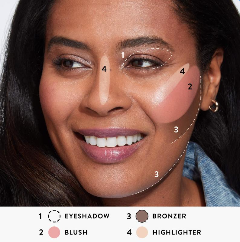 ·Bronzer: Sweep over face or contour along temples, cheeks, and jawline.