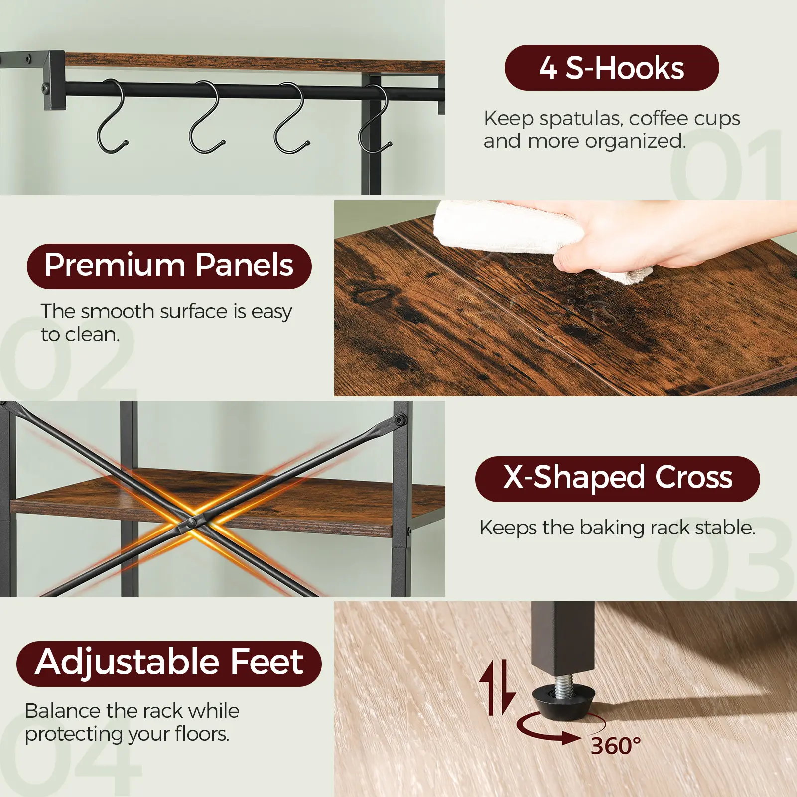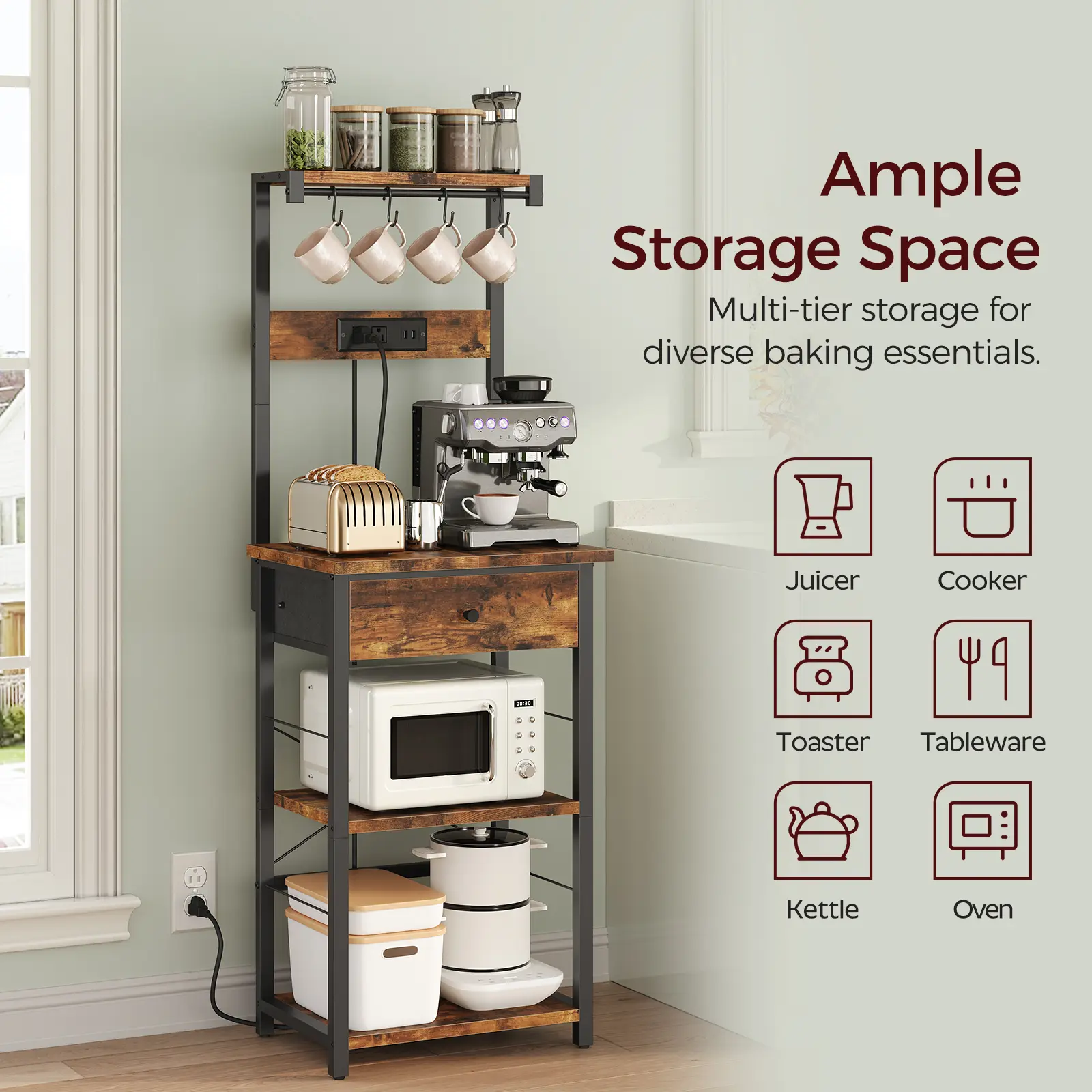 ·Bakers Rack with Power Strip: The built-in power strip with 2 AC outlets, 2 USB ports and a 59-inch power cord allows you to plug in small appliances like microwaves and coffee makers, meeting diverse power needs and boosting baking efficiency