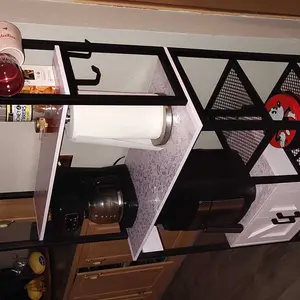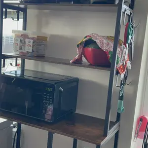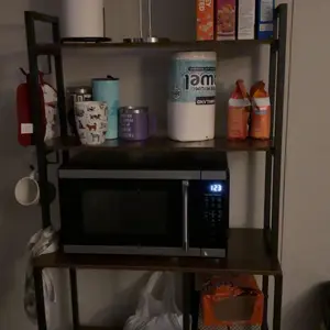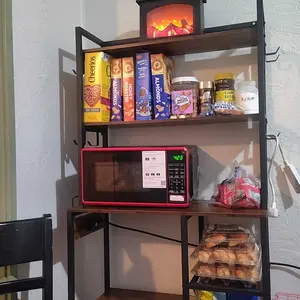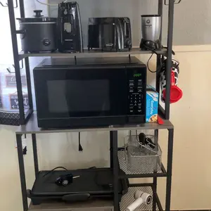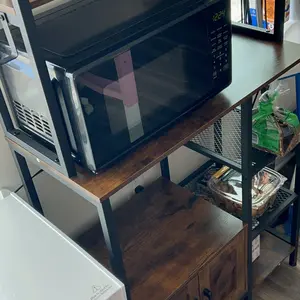 ·【Microwave Oven Stand with Variety Storage Options】 Easily put microwave oven on large board or on cabinet, manage seasonings on spice racks, put pots and pans on storage shelves, or hang kitchen gloves and towels on hooks, this kitchen hutch provides different storage choices.