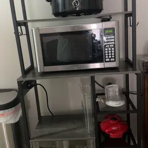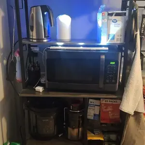 Kitchen Microwave Rack with Ample Storage Features a closet, broad countertop, eight L-shaped hooks, and a large-capacity cabinet. Store small items in the closet, place coffee machines and microwaves on the countertop, hang shovels and gloves on the hooks, and store dishes in the cabinet for a tidy kitchen.