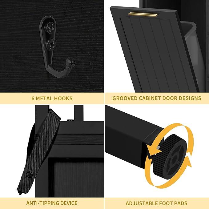 Solid & Durable Construction: Meet your kitchen's up-to-date friend! Our baker's racks with trash can is built to last with sturdy P2 water-repellent engineered wood, handling up to 150 pounds.6 metal hooks can use these hooks to hang pots, pans, utensils, towels, oven gloves, cookbooks and other items. Non-slip feet keep floors scratch-proof. Solid, durable, ready for any challenge.