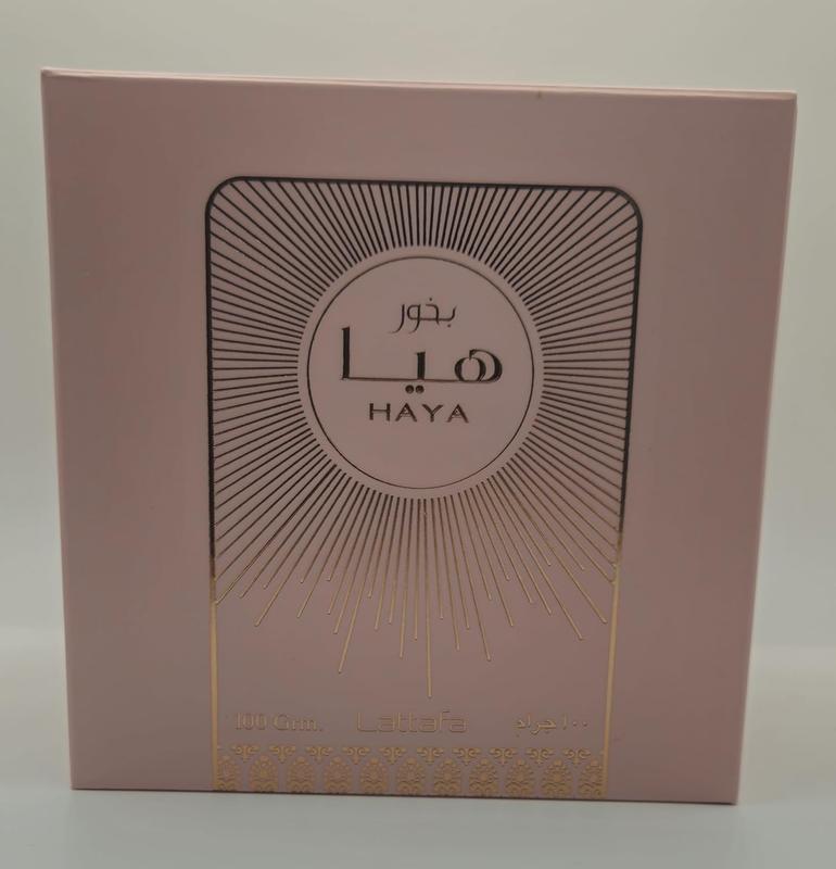 Indulge in the luxurious aroma of Bakhoor Haya by lattafa, a 100-gram solid incense blend crafted with care and precision.