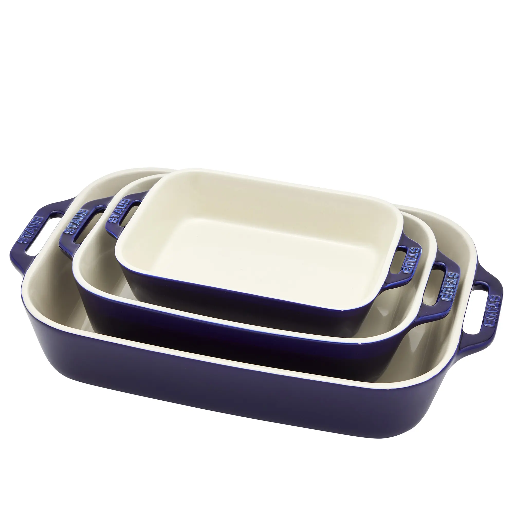This baking dish set features three nestable rectangular bakers for all your sweet and savory baking needs, whether you’re cooking for a crowd or just for two. STAUB stoneware bakers gently retain heat and won't absorb moisture, producing a delicious result for all your favorite recipes. The comfortable, large handles make maneuvering hot dishes easy. Ideal for lasagna, casseroles, and desserts, as well as roasted meats and vegetables, these bakers are essential dishes in the kitchen.