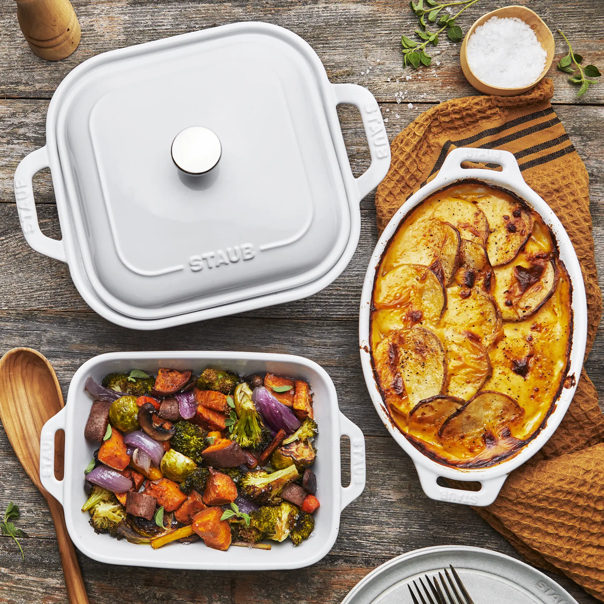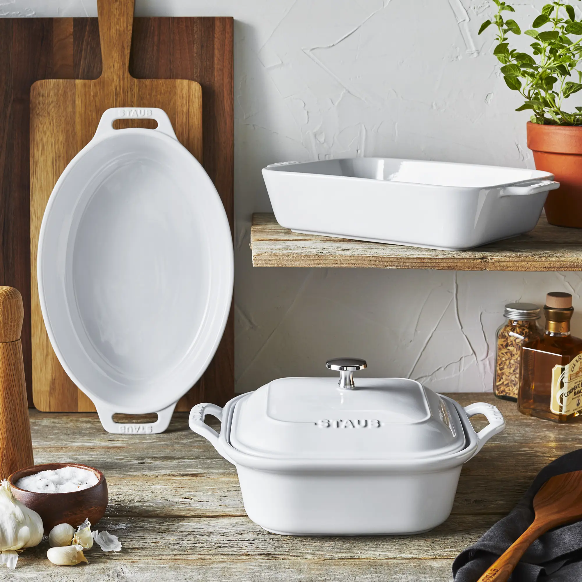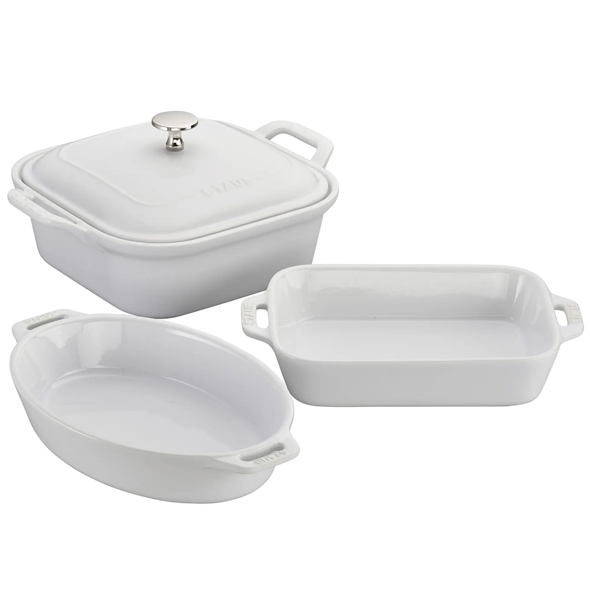 The Staub 4-Piece Baking Set is the secret to savory casseroles and delicious desserts. The porcelain enamel glaze prevents absorption of moisture during baking, so foods won't dry out. Available in three finishes, the set is equally beautiful and durable, transitioning beautifully from the oven-to-table. Choose from a rainbow of French flag colors: white, dark blue, or cherry red.