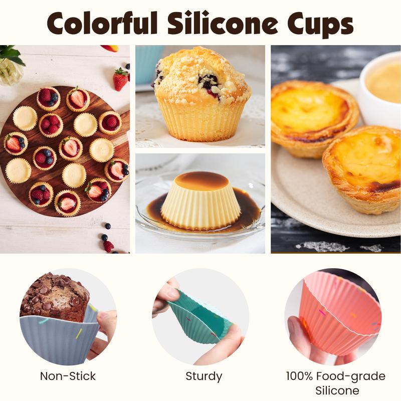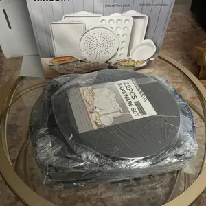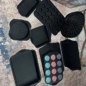 Set includes: a large cookie pan (17.75''*12.01''), a medium cookie pan (15.75''*10.24''), a mini muffin pan (16.54''*10.43''), two baking pan (14.8''*12.99'')(11.02''*8.78''), a round pan (10.04''*8.46''), a 12 cup muffin pan (17.32''*10.63''), a large roaster pan (17.91''*11.61''), a loaf pan (11.81''*5.91''), 12 colorful silicone cups.