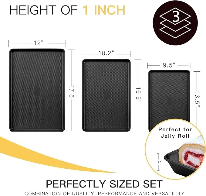 ·ALL EXCLUSIVE SET - This baking pan set includes 3 nonstick cookie sheets (13''x9'' /15''x10'' /17.5''x12''). They are just the right size, small for baking cookies, pastry, and lasagna, medium size for baking jelly rolls, large size for baking chicken and vegetables, etc. Just one set can easily satisfy your daily baking needs and help you take your baking to the next level.