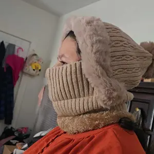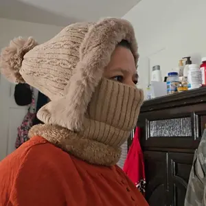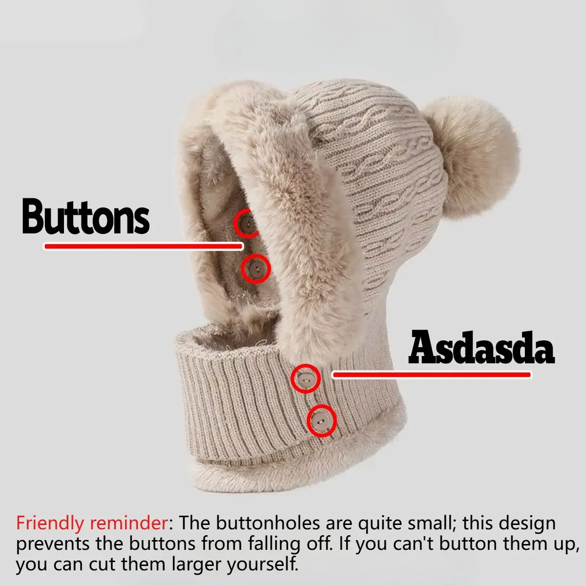 The actual product has a hat circumference of 55-60cm, a neck warmer height of 13cm and a width of 22cm, a mask height of 7cm and a width of 20cm, and a hat depth of 20cm. The coverage area can reach the bridge of an adult's nose, and the buttonholes are located on both sides of the mask.