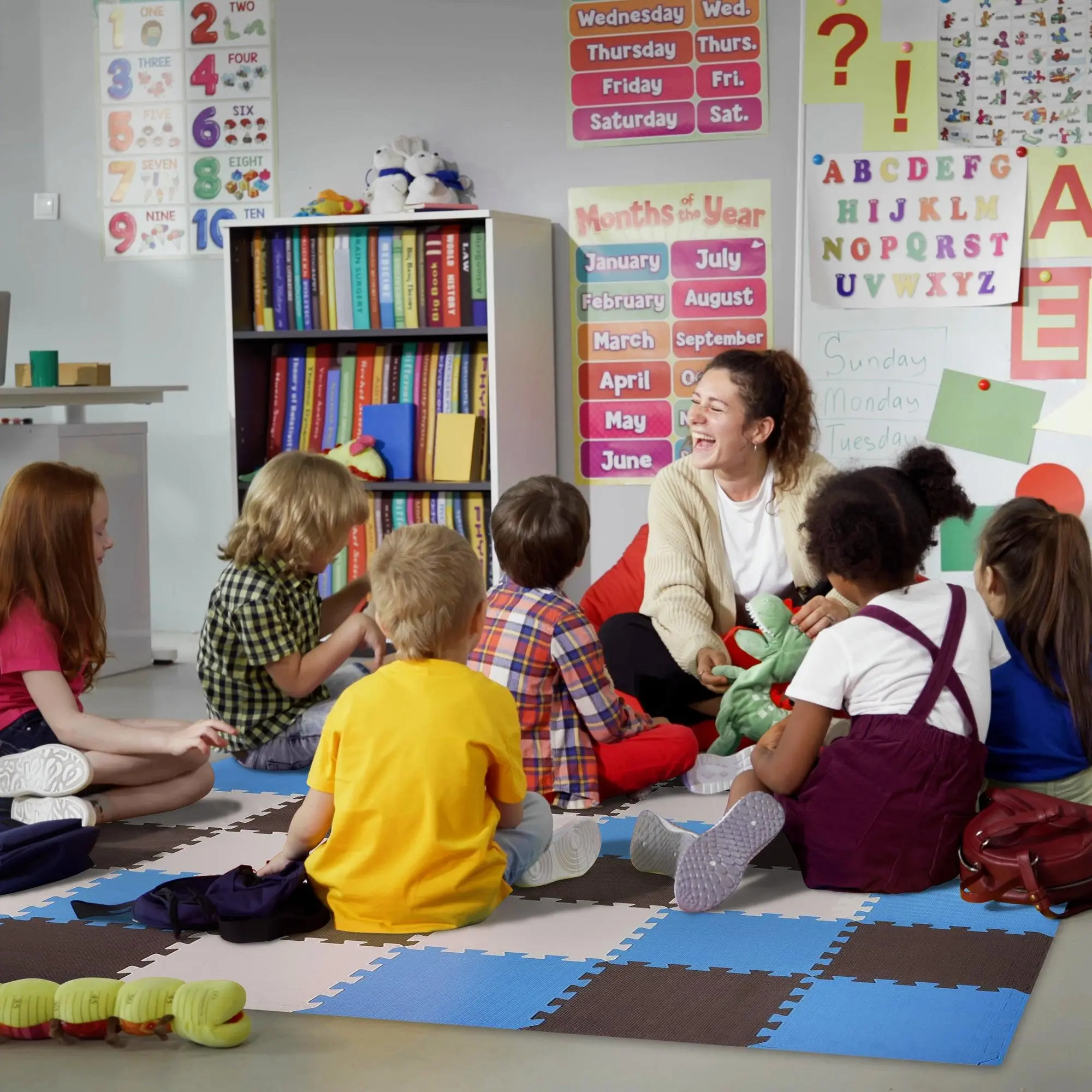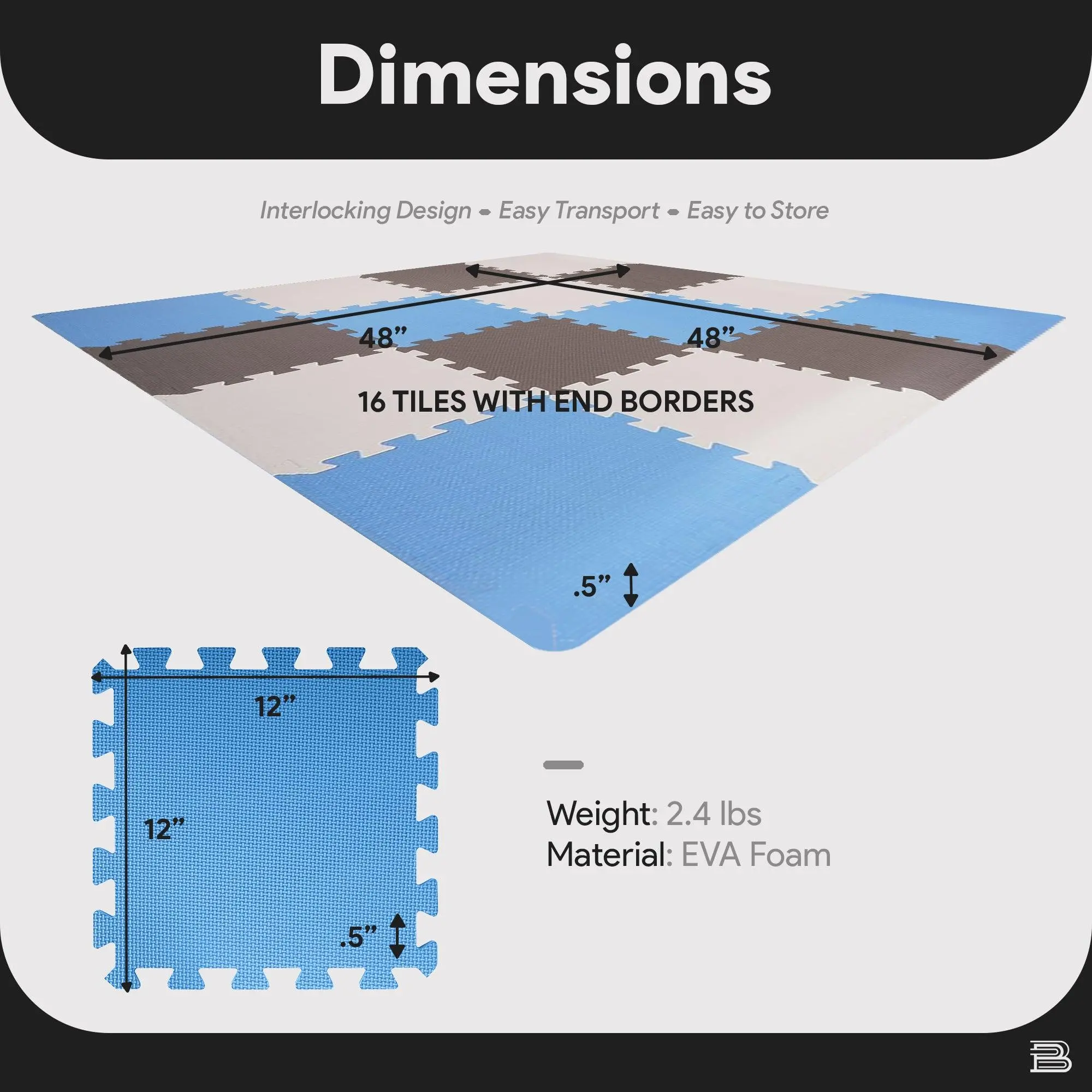 Featured color scheme of blue, brown, and beige, this interlocking mat pack covers up to 16 square feet of play space, with each tile measuring 1 square foot