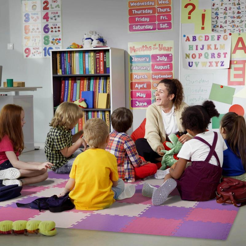Featured color scheme of pink, purple, and beige, this interlocking mat pack covers up to 16 square feet of play space, with each tile measuring 1 square foot