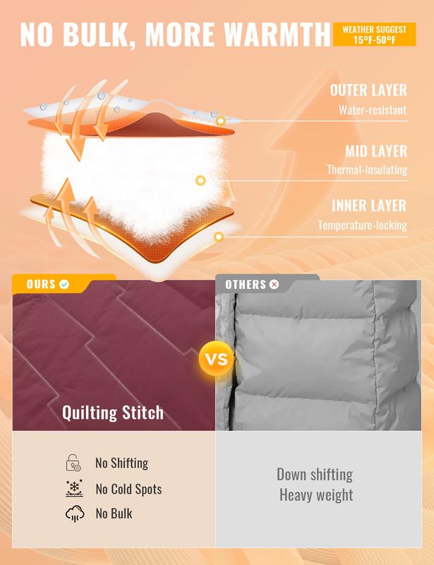 Warm & Water-Resistant: Designed for cool weather, this puffer jacket features a premium cotton shell that retains heat without shedding or clumping. The water-resistant finish outer layer repels wind, light rain, and snow, keeping you dry and cozy in 40–65°F conditions.
