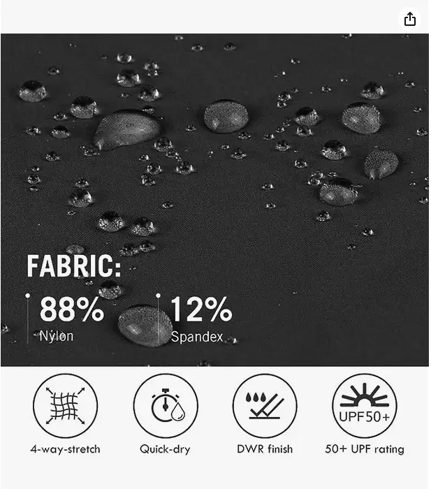 ·88% nylon, 12% Spandex. UPF50+ , DWR Water Repellant