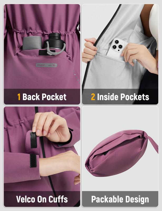 ·Lightweight & Packable: This women's running rain jacket is lightweight and packable. Made from ultra-light material, it can be folded into its back pocket, turning into a small bag for easy carrying, perfect for those who travels a lot or travels a lot for work.