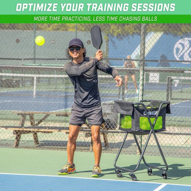 GoSports Pickleball and Tennis Caddy helps you get more out your practice! This premium ball cart holds 140 pickleballs or 175 tennis balls and features fully rotating wheels for hassle-free transportation to any court. Pickleball is exhausting enough without the added strain of bending down to collect your balls during practice. Now you can easily grab ball after ball and streamline your training. It's perfect for avid pickleball players and coaches. With a durable steel frame and tear-resistant bag, our pickleball caddy is made to last year after year. Best of all, the foldable design is great for compact storage and travel. Just remove the basket and collapse the frame! The basket easily detaches for solo use as a convenient ball bag as well. Weighs approx. 15 lbs empty and measures 20.8 L x 21.1 W x 34.5 H inches Upgrade your training sessions with GoSports GS PRO Pickleball Caddy!