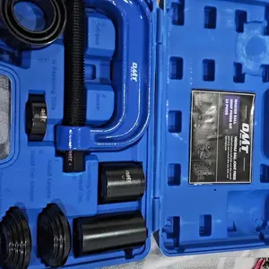 El kit dedidae prensa de rótulas / herramienta de extracción de bujes se encuentra en un estuche de transporte de plástico moldeado por soplado resistente, de 27,9 cm x 7,6 cm x 38,1 cm (11 pulgadas x 3 pulgadas x 15 pulgadas), con asa para un almacenamiento fácil, seguro y una organización rápida de las piezas.