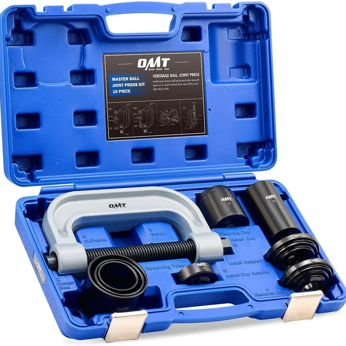 Utilice el juego de prensa de rótulas de Orion Motor Tech, herramienta para rótulas / herramienta de extracción de bujes con adaptador para tracción en las cuatro ruedas (4WD), para extraer sin esfuerzo las piezas ajustadas por presión, incluidas rótulas, juntas universales, pasadores de anclaje de freno y más, en la mayoría de los vehículos de tracción en dos ruedas (2WD) y tracción en cuatro ruedas (4WD), sin necesidad de desmontar el brazo de control del vehículo.