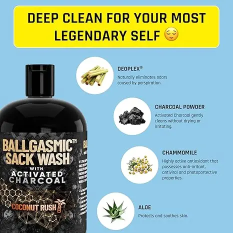 Charcoal activated ball wash to calm, soothe and hydrate without drying or stripping. Win the battle against itching, chafing and get rid of sack stank for good!