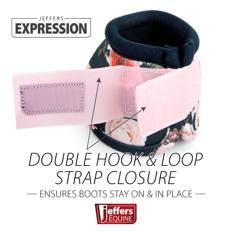 The Jeffers Expression No-Turn Bell Boots are designed to provide superior protection for your horse's hooves, heels, and coronary band. Made from durable nylon, these boots effectively absorb shock from overreaching while shielding your horse's hooves from potential injury. Whether used during turnout or riding, these boots are a must-have for safeguarding your horse's feet. Featuring limited-edition Jeffers Expression patterns, they combine practical protection with standout style. The double hook-and-loop closure ensures a secure fit, while the soft, jersey-lined comfort collar helps prevent rubbing on sensitive pasterns.