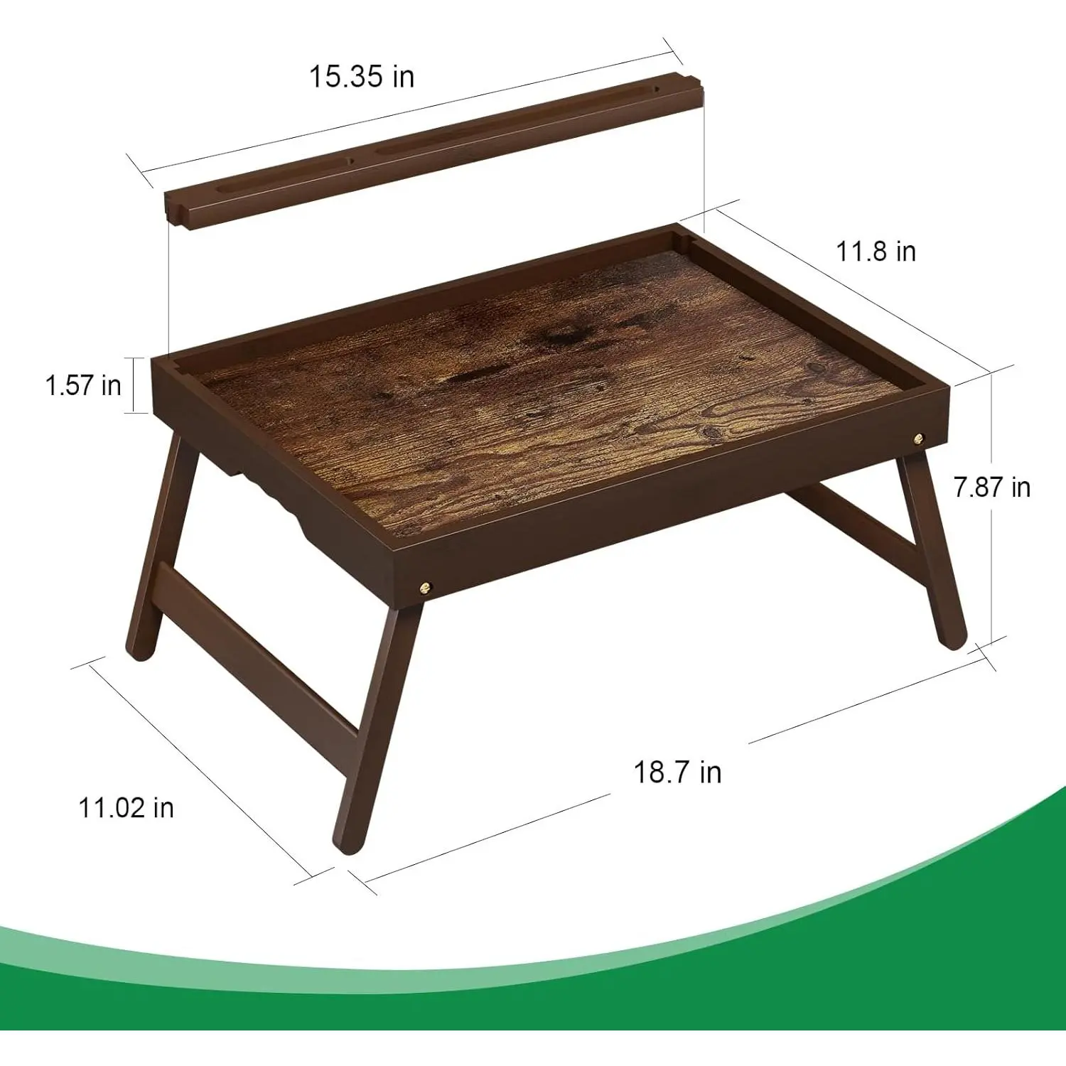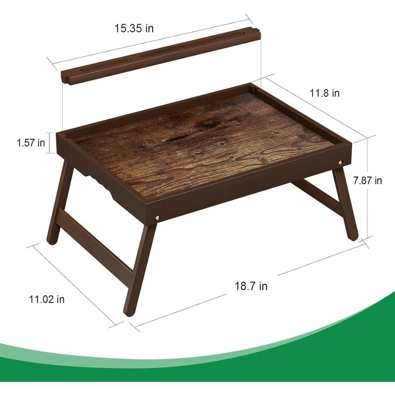 The Bamboo Breakfast Tray features foldable legs and a detachable stand. It includes an ergonomic handle for easy use. Perfect for eating, working, using a laptop, tablet, or phone. The vintage walnut finish adds a touch of elegance. Ideal for bed trays.