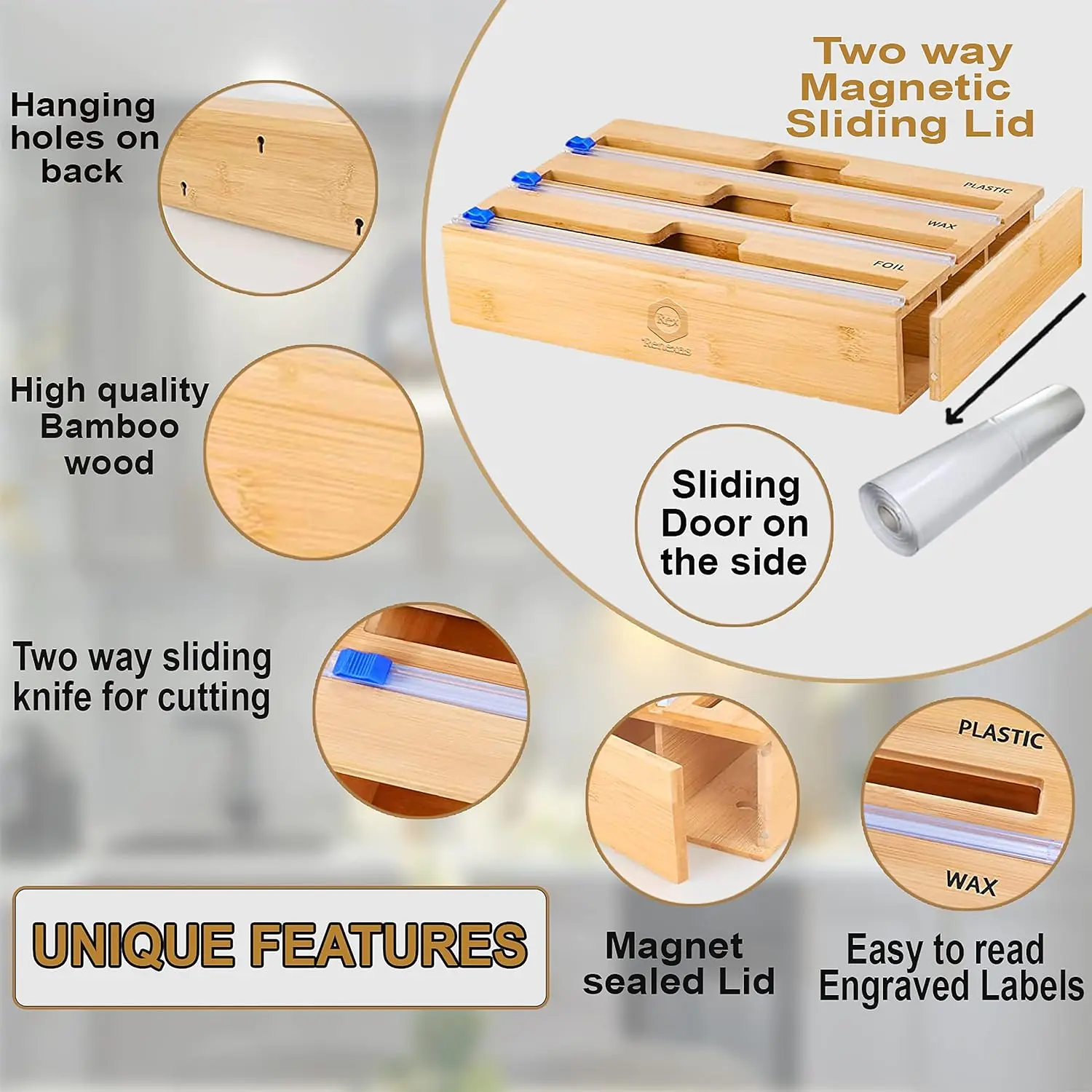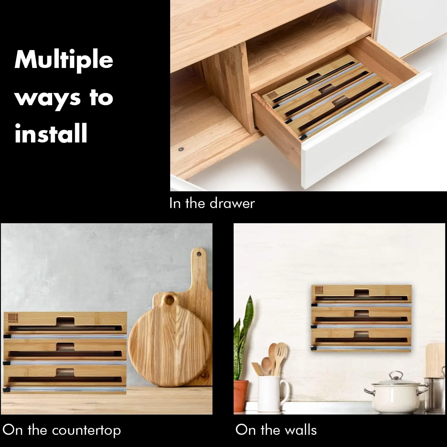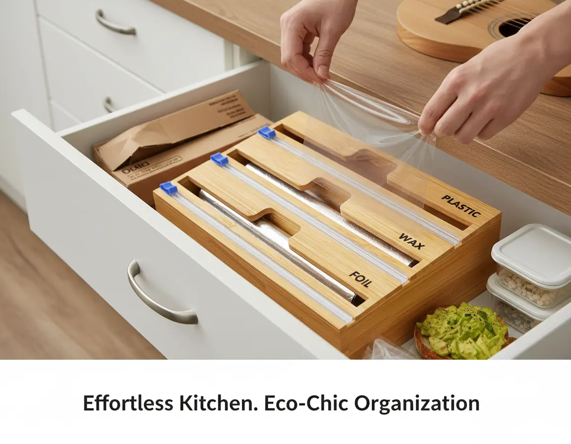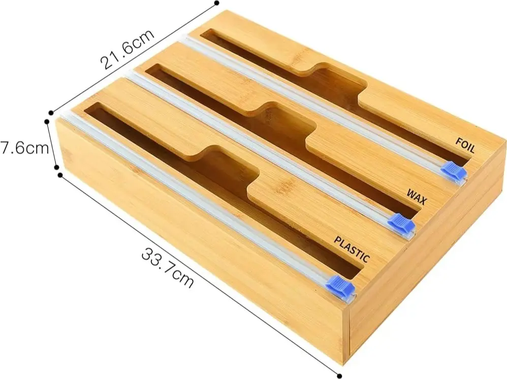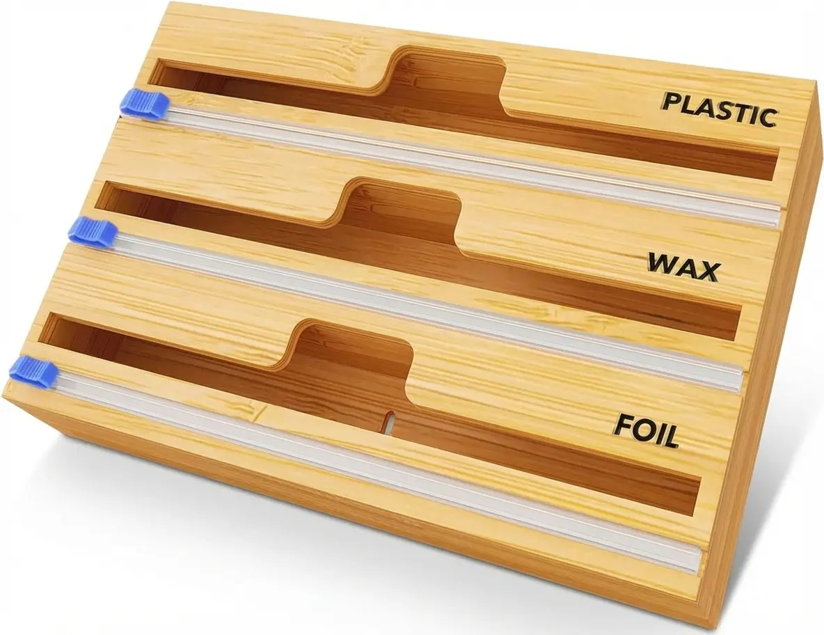 ·3-in-1 Wrap Organizer: Efficiently store aluminum foil, plastic wrap, and wax paper in one compact bamboo dispenser, perfect for keeping your kitchen organized and clutter-free.