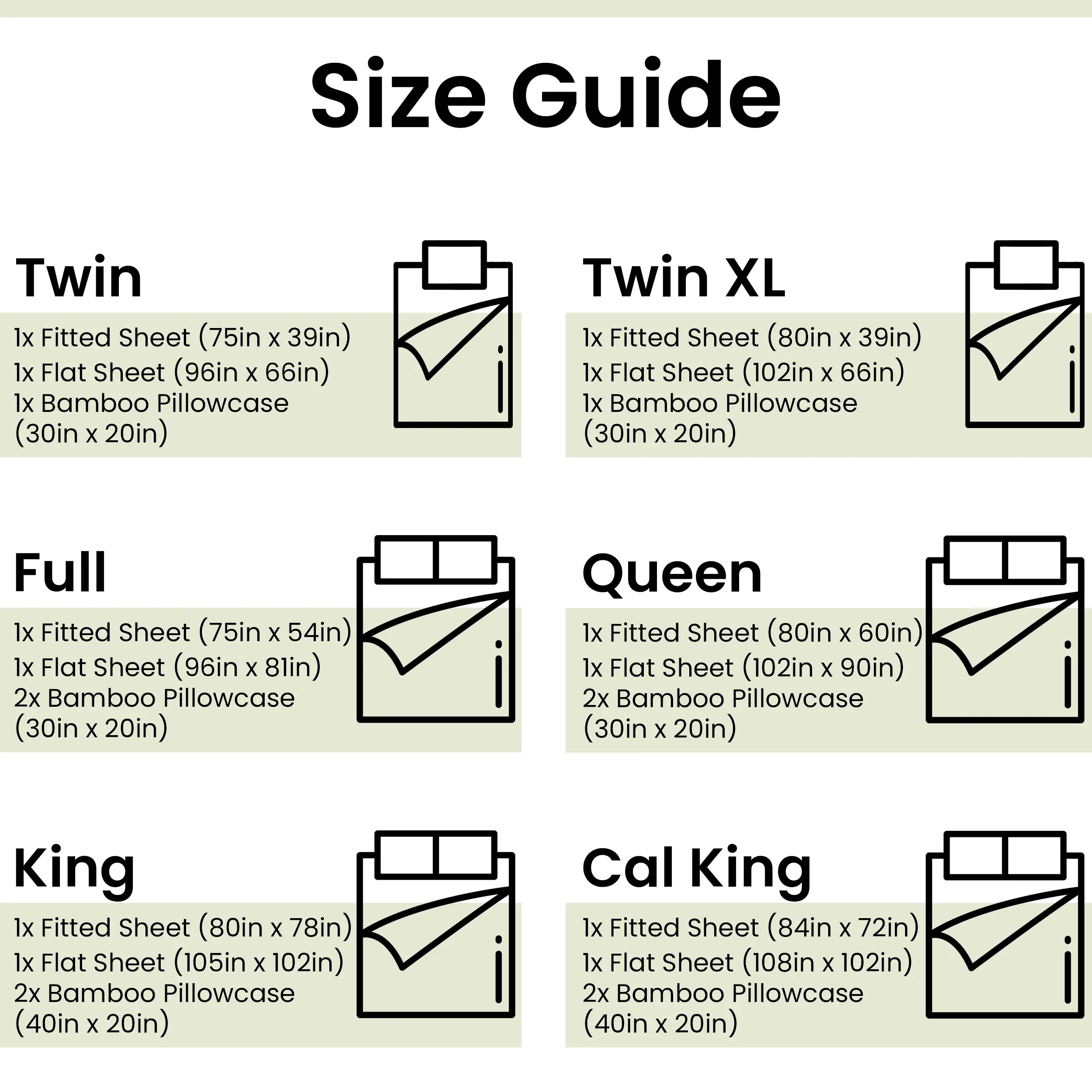 Cal King: Flat Sheet: 108x102+4", Fitted Sheet: 72x84, Pillowcase: 20x40+4"