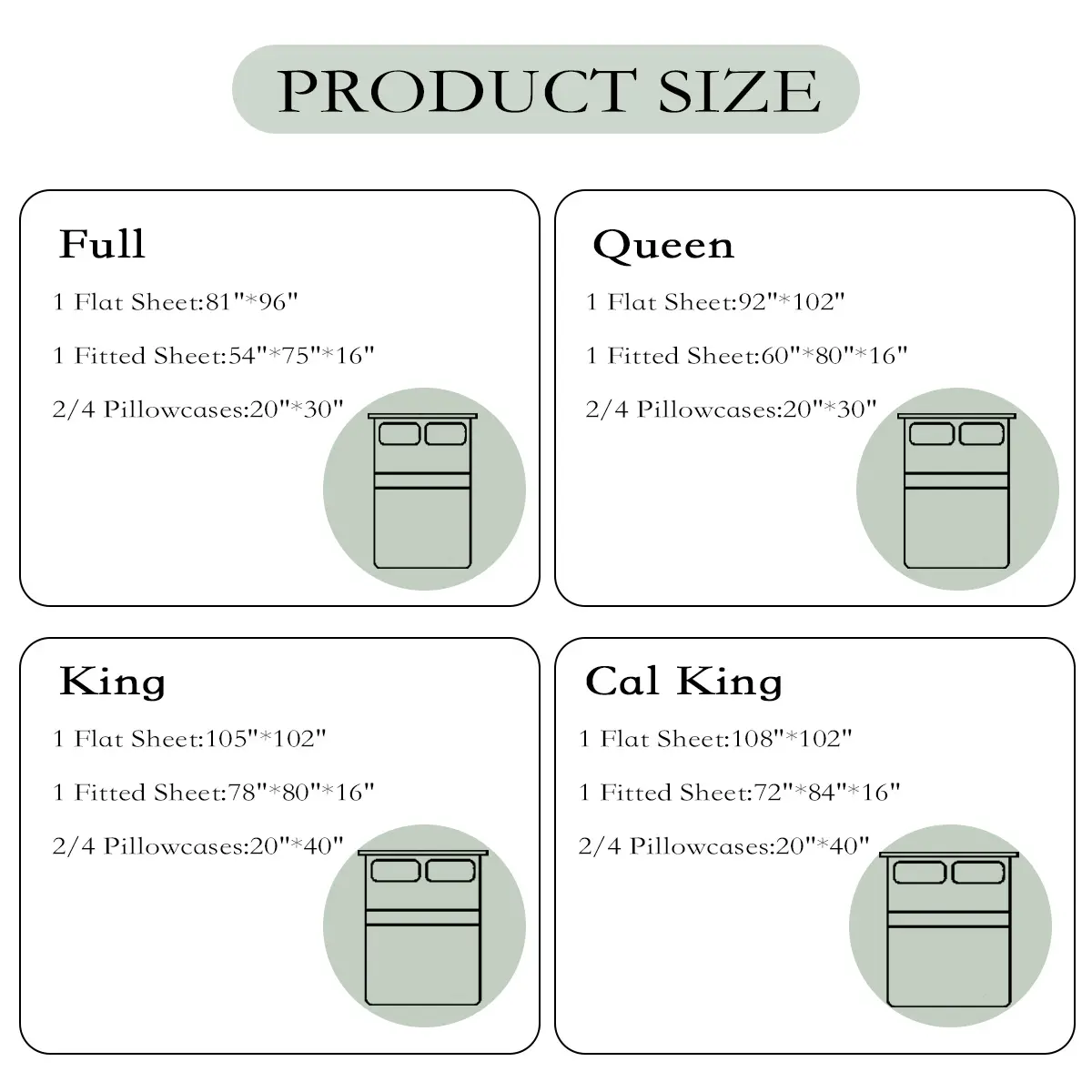 Cal King: 1 Flat Sheet 108"*102"+1 Fitted Sheet 72"*84"*16" +4 Pillowcases 20"*40"