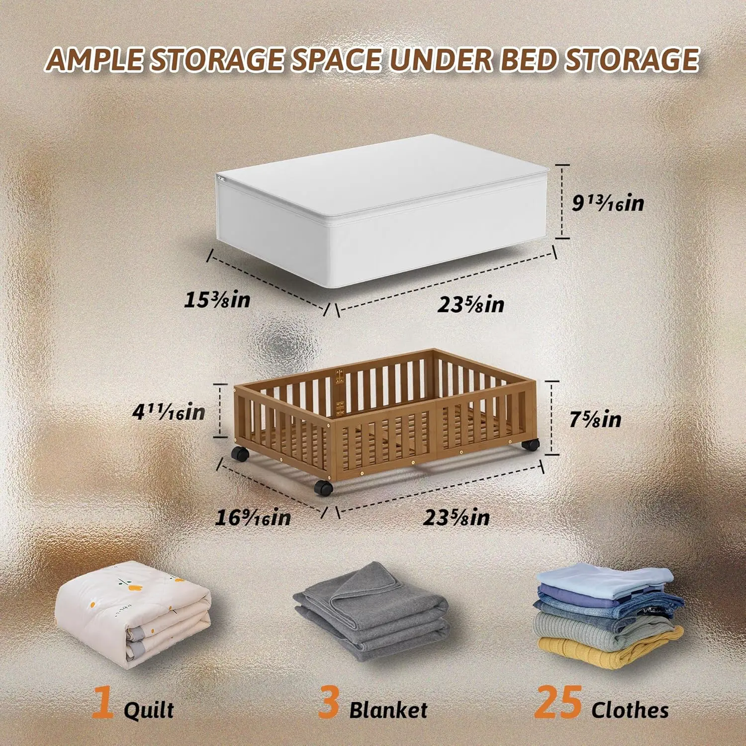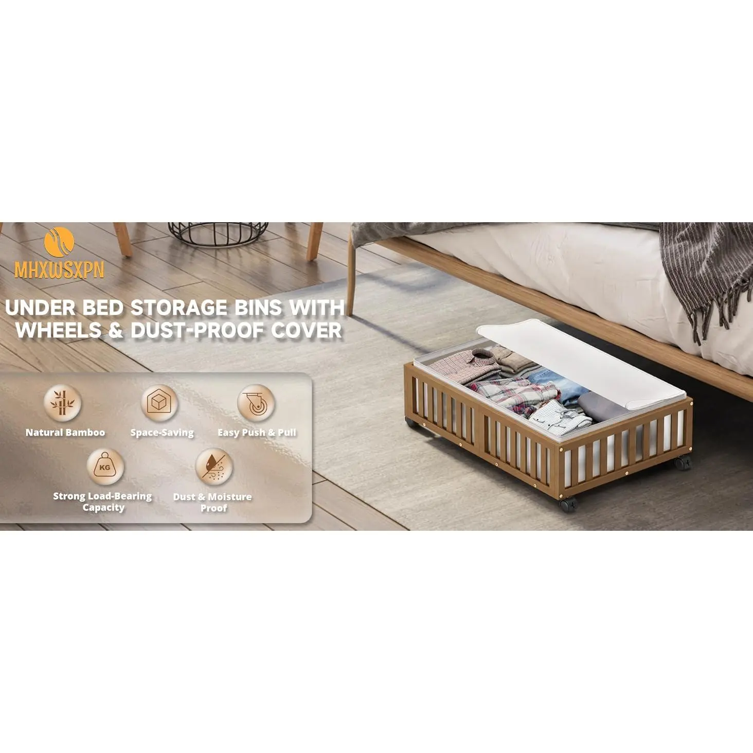 𝗠𝗮𝘅𝗶𝗺𝗶𝘇𝗲 𝗦𝘁𝗼𝗿𝗮𝗴𝗲 𝗦𝗽𝗮𝗰𝗲: Efficiently utilize your storage space with our bamboo under bed storage container.Allows you to store items out of sight, freeing up valuable floor space!Ideal for small bedrooms and apartments, fitting under beds, in closets, on shelves, or beneath couches.Size: 23.62"L x 16.54"W x 7.28"H, this under bed organizer provides ample space for storing clothing, shoes, bedding, and more, effectively optimizing under bed storage𝗦𝘁𝘂𝗿𝗱𝘆 𝗮𝗻𝗱 𝗗𝘂𝗿𝗮𝗯𝗹𝗲 𝗖𝗼𝗻𝘀𝘁𝗿𝘂𝗰𝘁𝗶𝗼𝗻: Our under bed drawers on wheels is crafted from 100% Real bamboo, ensuring long-lasting quality and a stylish, natural aesthetic that complements any bedroom decor.Equipped with 4 rotating wheels, each capable of bearing up to 120 pounds.The 48L large-capacity dustproof bag is designed for storing seasonal clothing, bedding, and household items.It's a versatile storage solution that can be customized based to your needs.𝗦𝘁𝗮𝗰𝗸𝗮𝗯𝗹𝗲 𝗮𝗻𝗱 𝗩𝗲𝗿𝘀𝗮𝘁𝗶𝗹𝗲: Our underbed storage container units are designed to be stackable.You can easily create a customized storage solution by stacking multiple units together.Whether you have limited floor space or just want to maximize your storage potential, you can adjust the storage units to your specific needs.These storage bins have a wide range of uses.They’re not only suitable for bedroom but also for toys, student dormitory, tool room and more.Say goodbye to clutter!𝟯𝟲𝟬-𝗗𝗲𝗴𝗿𝗲𝗲 𝗥𝗼𝘁𝗮𝘁𝗶𝗻𝗴 𝗪𝗵𝗲𝗲𝗹𝘀: Our under bed rolling storage comes equipped with four detachable sturdy wheels capable of rotating 360 degrees.This organizer effortlessly glides in and out from under the bed, allowing you to access your belongings with ease even in narrow spaces.Each wheel boasts an impressive weight-bearing capacity of up to 120 pounds, ensuring stability and reliability even when fully loaded with items.𝗟𝗮𝗿𝗴𝗲 𝗖𝗮𝗽𝗮𝗰𝗶𝘁𝘆 𝗗𝘂𝘀𝘁𝗽𝗿𝗼𝗼𝗳 𝗕𝗮𝗴: To provide additional protection for the items you store, each under bed storage unit comes with an oversized dust-proof bag as an accessory.These bags are specially designed to perfectly fit the stacked storage drawers, forming a sealed barrier to protect your belongings from dust, dirt, and moisture, keeping them clean and protected.Now, your seasonal clothing, bedding, and shoes can stay fresh and in their original condition for longer periods of time
