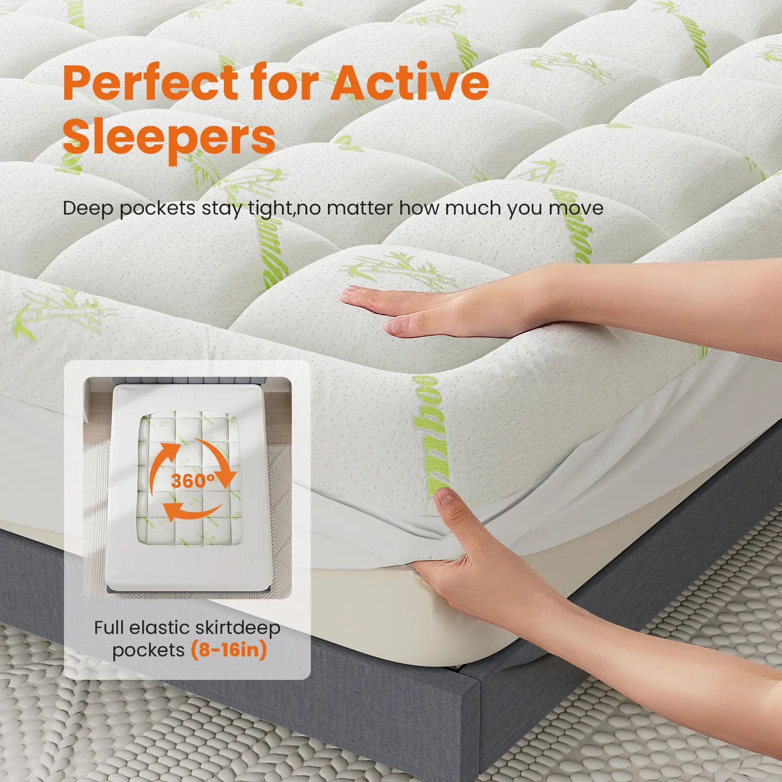 ·【Value-Driven Luxury & Finish】 This bamboo mattress topper delivers exceptional value. It combines the plush feel of a high-end memory foam mattress topper with the practical benefits of a cooling mattress protector. The elegant, quilted finish adds a touch of refined style to your bedding, ensuring your bed looks as good as it feels.