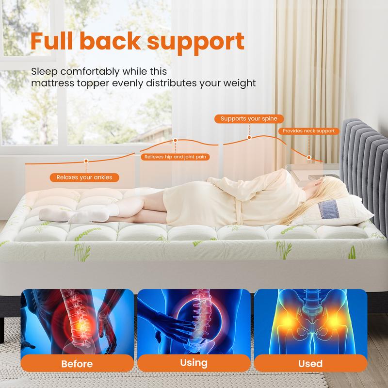 ·【Superior Comfort & Even Support】 Experience the ultimate in plush comfort with our premium foam mattress topper. Designed to perfectly fit your mattress, this mattress pad provides even support and contours to your body, transforming your ordinary mattress into a luxurious sleeping pad. It's the best bedding upgrade for a superior sleep surface.