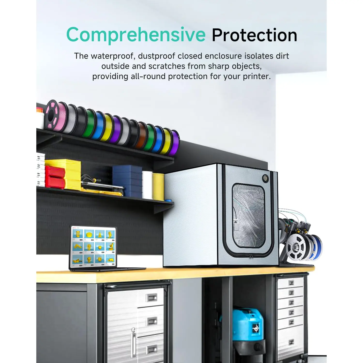 and Fireproof Safety Measures: Safeguard your 3D printer with fire-resistant materials and a robust structure to accidents. The enclosure effectively prevents dust particles from compromising print quality and protects against accidental contact from or pets.