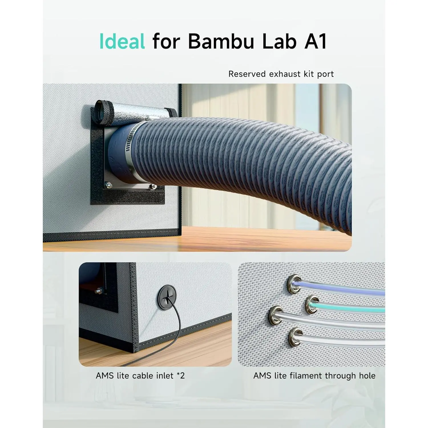 Designed for Bambu Lab A1 Combo: Specifically designed with AMS lite inlet and four-way pneumatic interface for Bambu Lab A1 users. The enclosure size is 550x600x670MM (21.65x23.62x26.38''). Please verify the dimensions carefully when purchasing for other printer models.