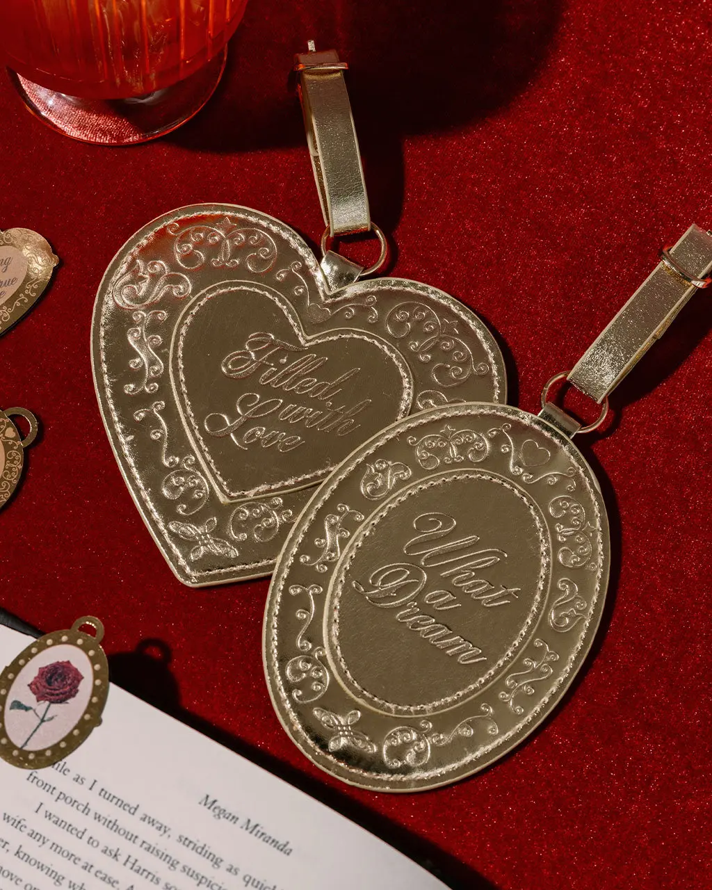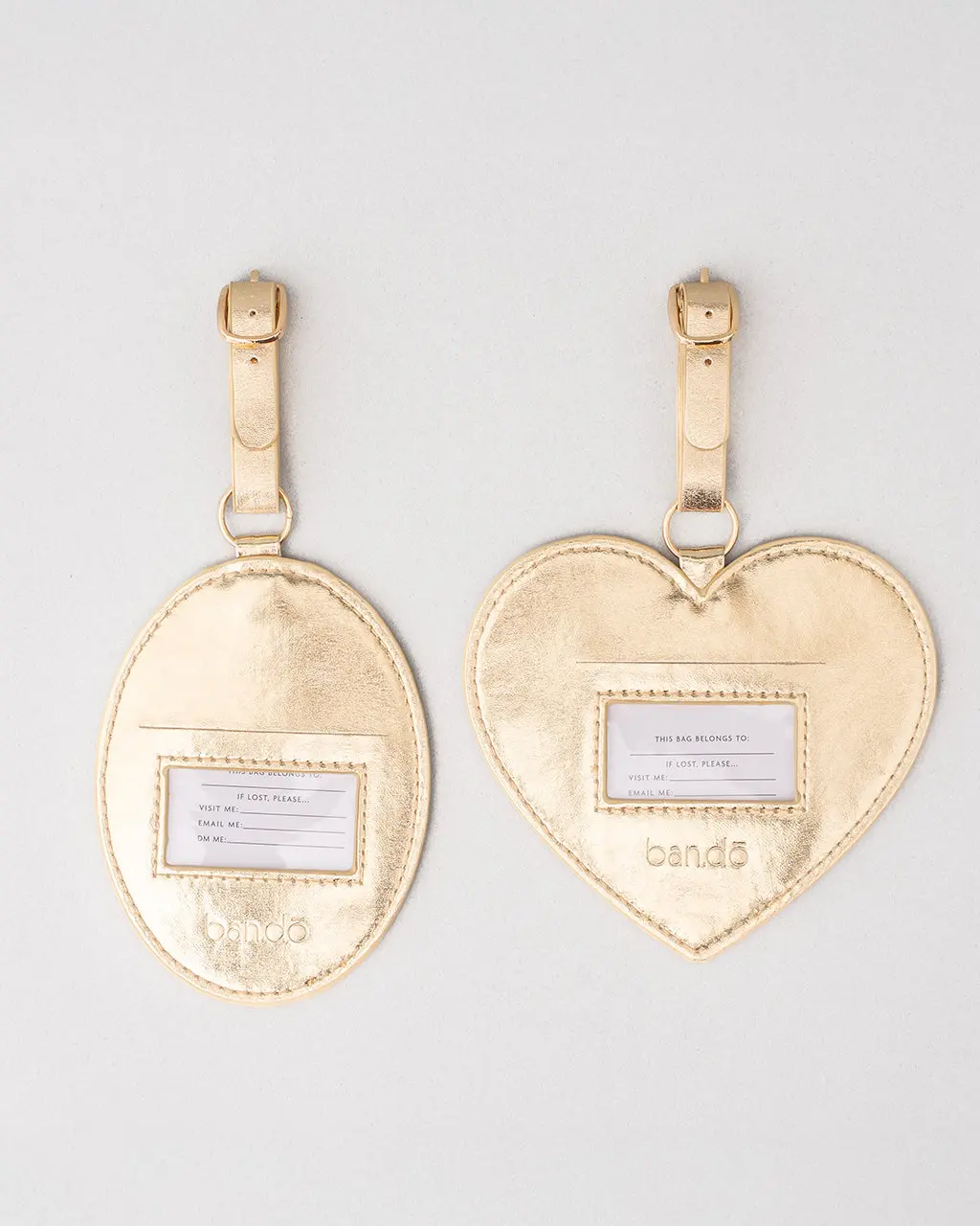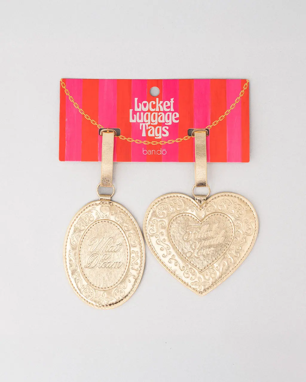 Travel just got a little cuter. This luggage tag set includes two metallic gold locket luggage tags, so you can spot your bag quickly. Made of durable vegan leather with secure buckle closures, they’re ready for your next trip.