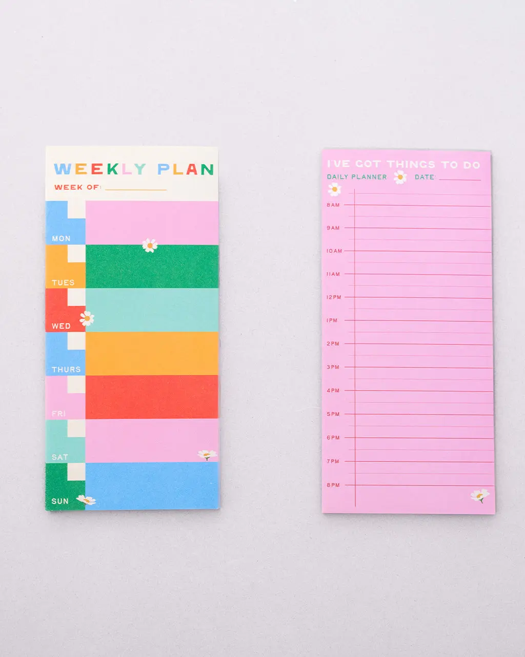 Meet your new planning duo. This set includes two notepads: one for the week and one for the day. The weekly pad has color-blocked sections for each day of the week, while the pink daily pad helps you plan your schedule by the hour.