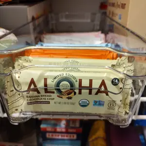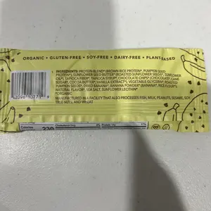 Ingredients : Protein Blend* (Brown Rice Protein*, Pumpkin Seed Protein*), Sunflower Seed Butter* (Roasted Sunflower Seeds*, Sunflower Oil*), Tapioca Fiber*, Tapioca Syrup*, Chocolate Chips* (Chocolate*, Cane Sugar*, Cocoa Butter*, Vanilla Extract*), Vegetable Glycerin*, Roasted Pumpkin Seeds*, Dried Banana*, Banana Powder* (Banana, Rice Flour*), Natural Flavor*, Sea Salt, Sunflower Lecithin*