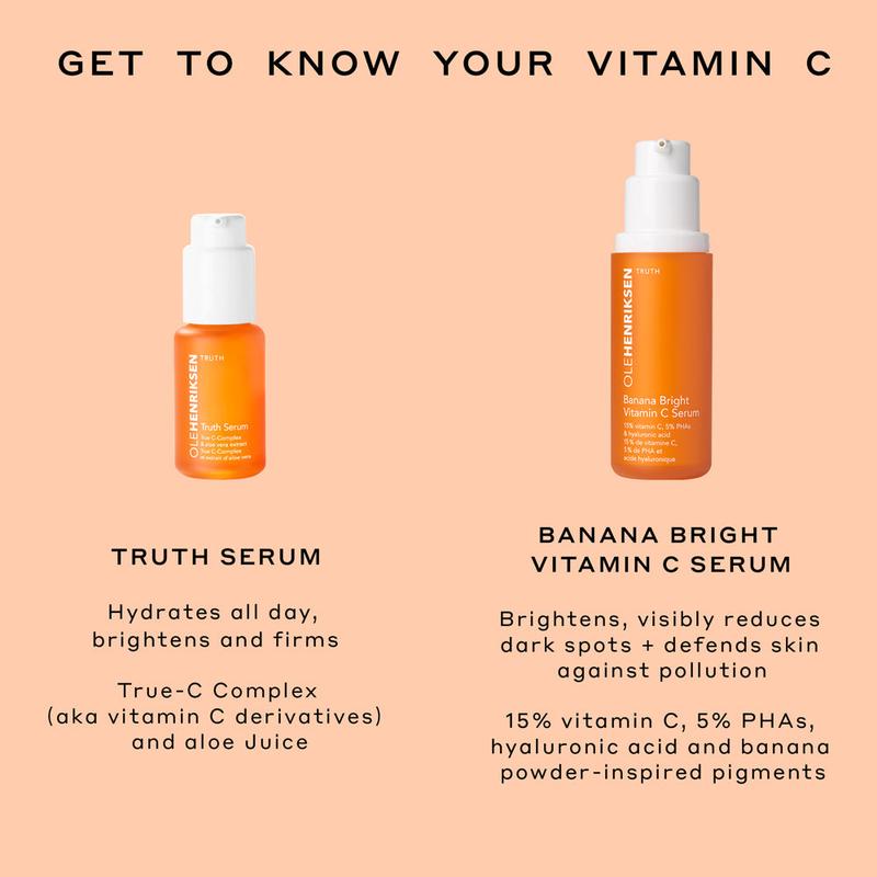 Both Banana Bright and Truth Serum brighten, firm, hydrate and improve the look of skin texture. The main difference is that Banana Bright Serum is Ole's highest concentration of vitamin C for daily use (15%). Banana Bright also contains 5% PHAs (polyhydroxy acids), which is a unique chemical exfoliant. Truth Serum contains an enhanced, stable vitamin C derivative (sodium ascorbyl phosphate). If you're new to using vitamin C skincare, we recommend starting with Truth Serum. Once you've developed a tolerance and want a higher concentration of vitamin C, we say glow bananas.