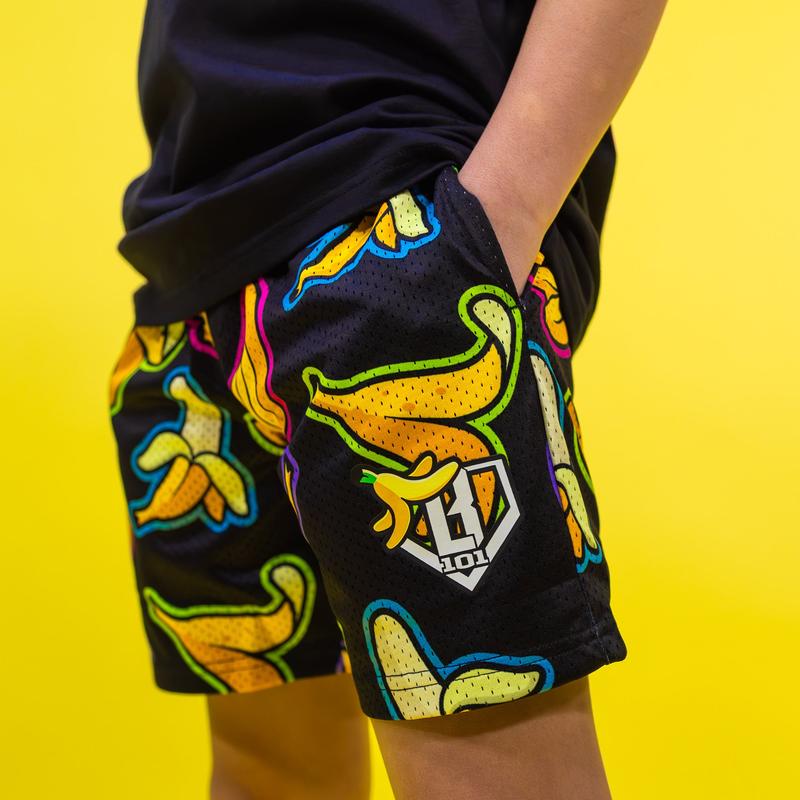Bring the juice to your lineup with the Baseball Lifestyle 101 Banana Shorts - Neon. These game-ready mesh shorts feature a wild all-over banana print with neon outlines that pop harder than a crushed fastball. Lightweight and breathable, they're built for everything from batting cages to beach days. The BL101 logo with a banana peel detail rounds out the look like a perfect 9th-inning closer. Swing loud, stay bold, and let your style steal the spotlight.