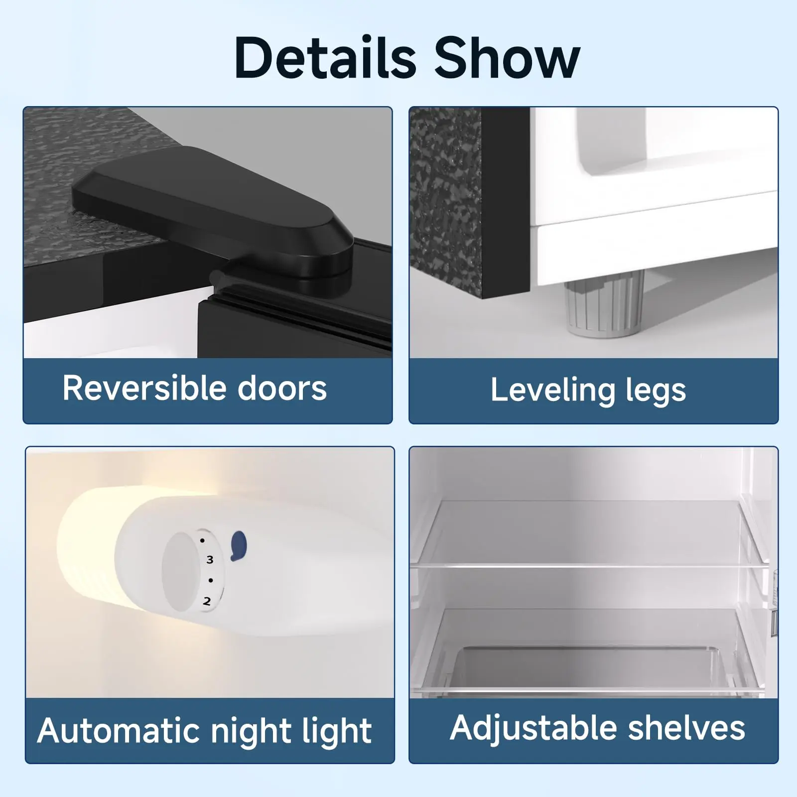 ·Enhanced Practical Details: Reversible doors, automatic interior LED light, bottom leveling legs, plus included ice tray, defrost tool, and egg shelf.