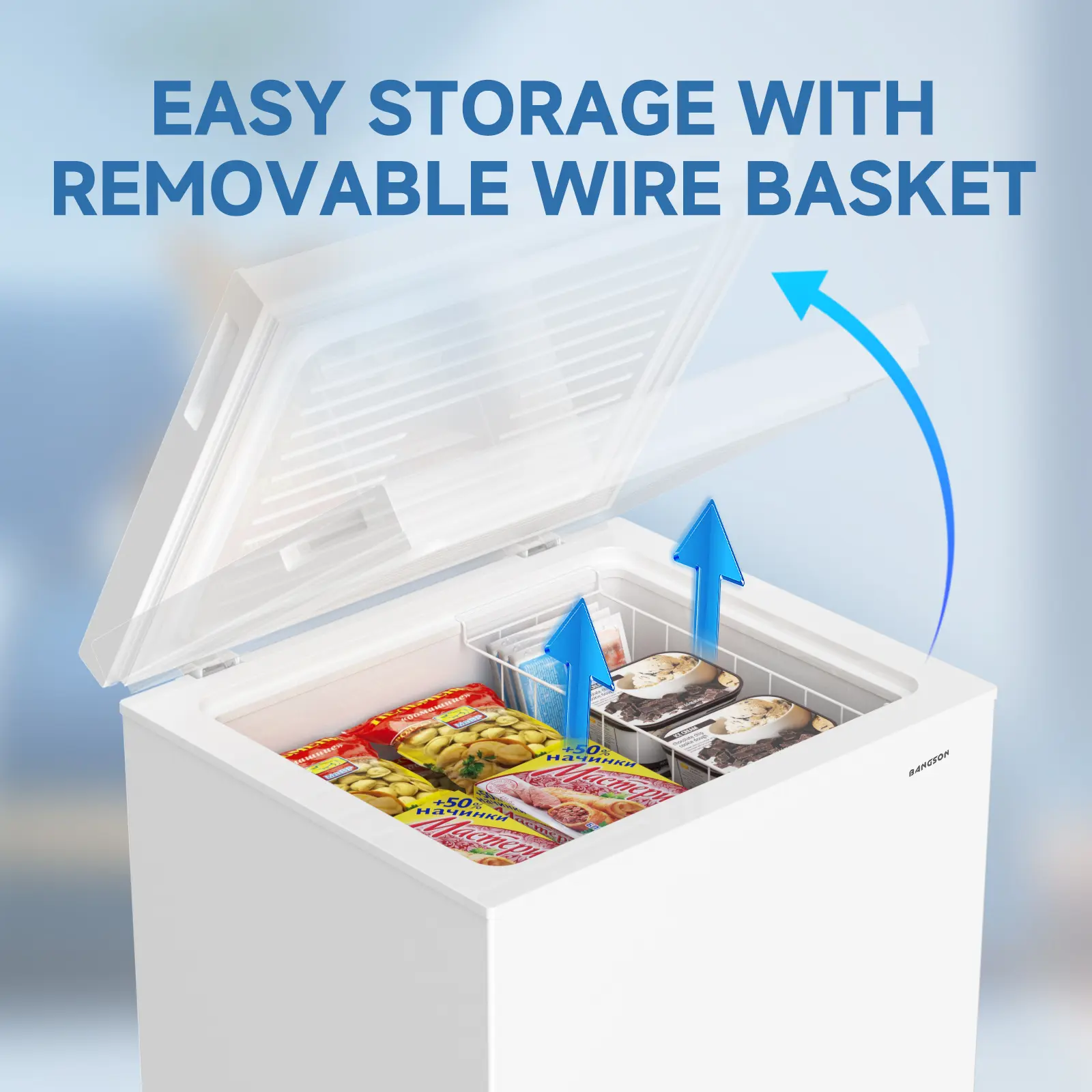 ·Removable Storage Basket: Organizes small items (frozen snacks, veggies, instant food) for easy access; lift to reach items underneath.