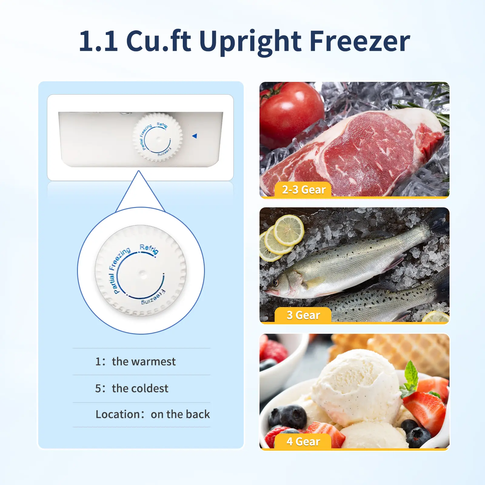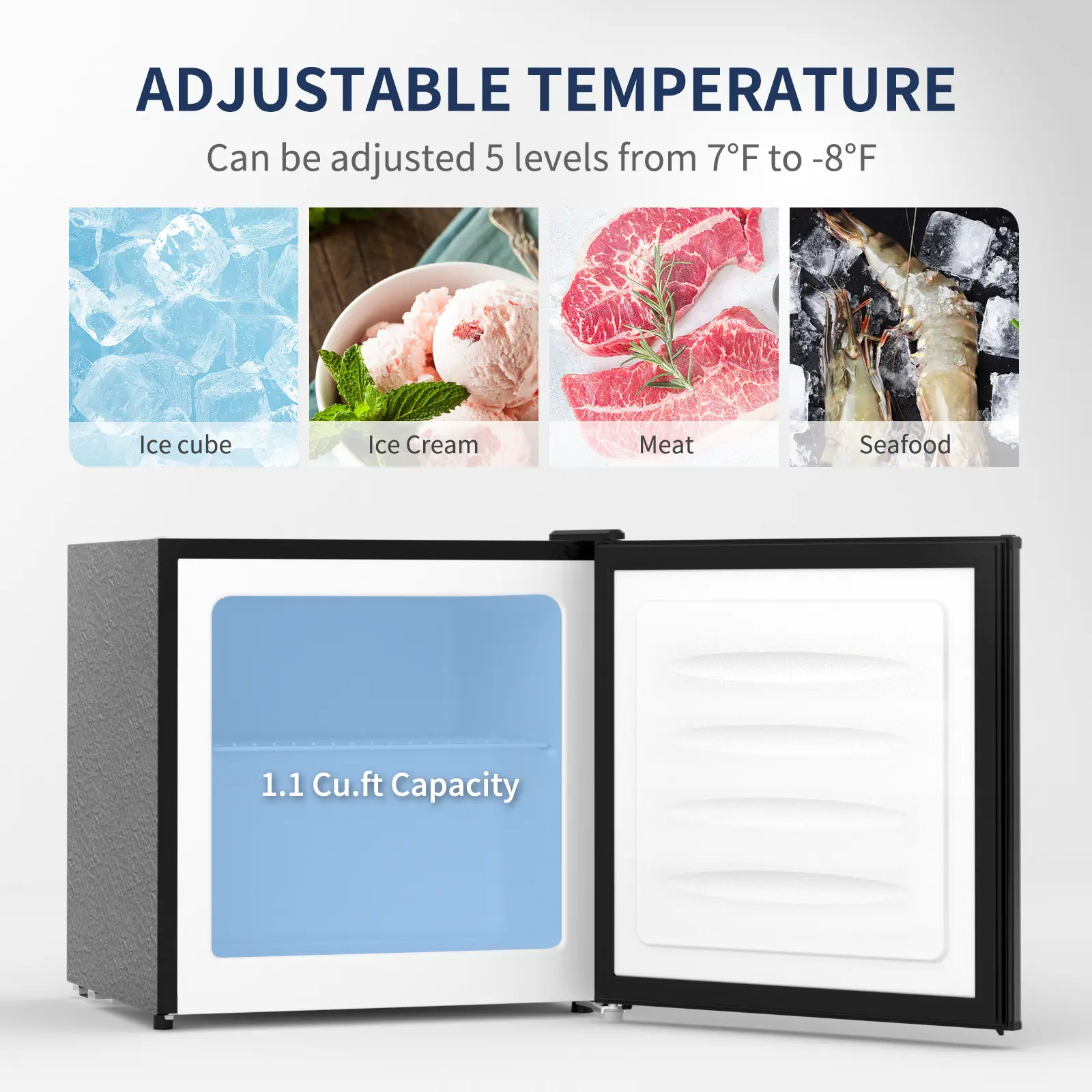 ·Spacious 1.1 Cu.Ft Storage: Upright freezer (18"W x 18.5"D x 19.1"H) fits fruits, veggies, seafood, and ice cream. Removable crisper adapts to food placement needs.