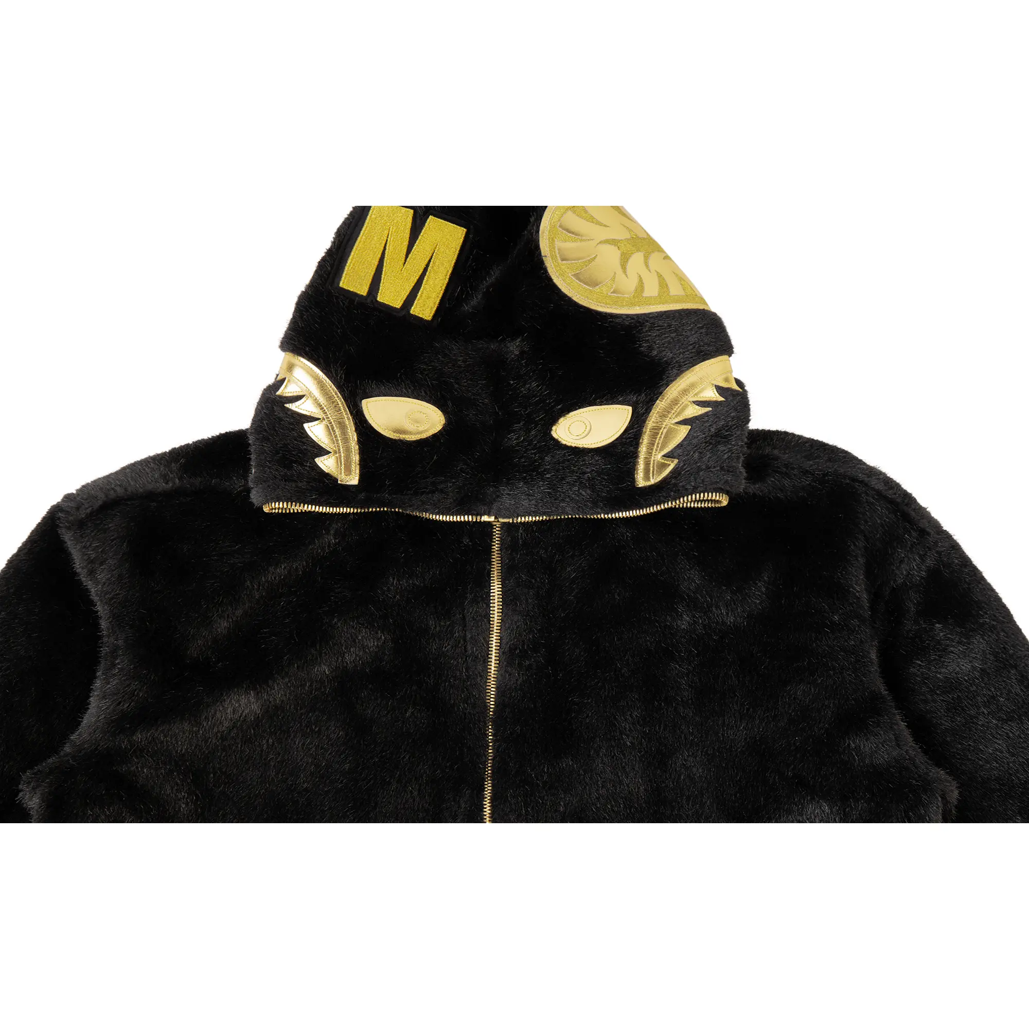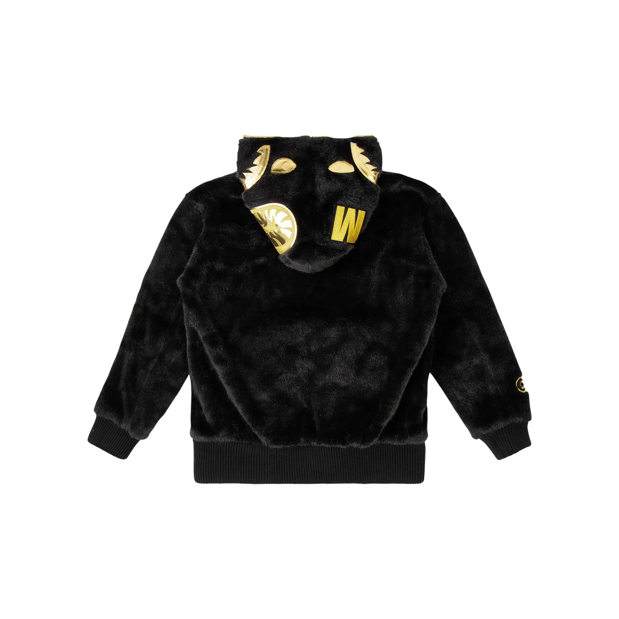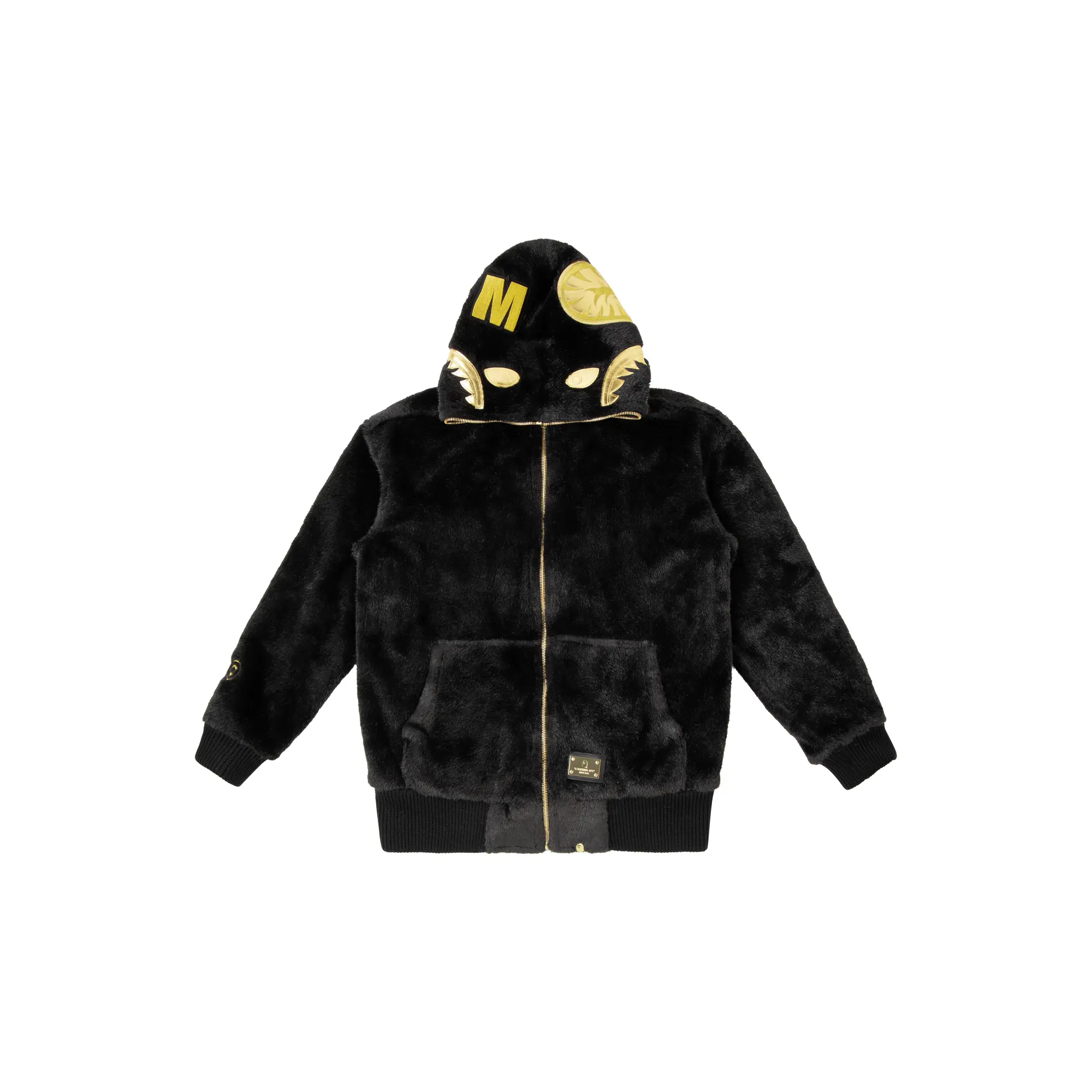 The BAPE Fur Shark Hoodie is a premium piece by the revered Japanese streetwear brand. Luxurious black shaggy faux fur covers the entire body, sleeves, and hood of the piece. Gold accenting is found on the full zip-up construction and shark motif on the hood. Gold Bape hardware branding appears on the lower left kangaroo pouch.