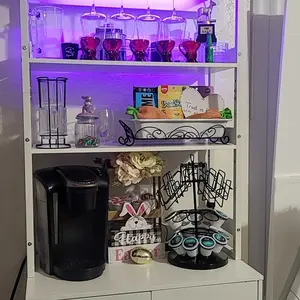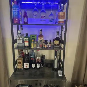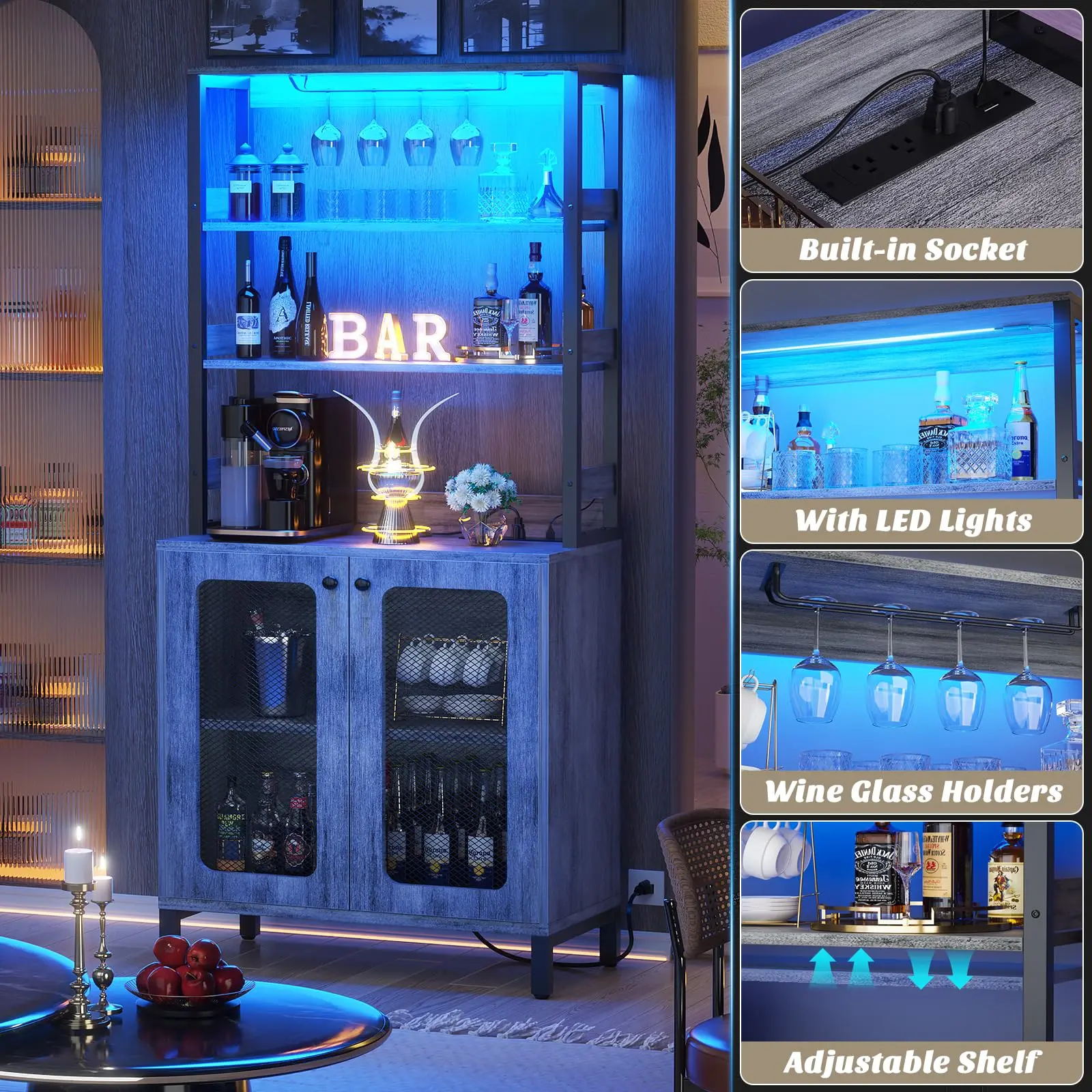 ·【Bar Cabinet with Charging Station】Our bar cabinet is equipped with 3 Outlets& 2 USB ports, which help you easily charge your coffee maker, juicers, bar accessories, glowing lights decorations even your phone and other electrical appliances.