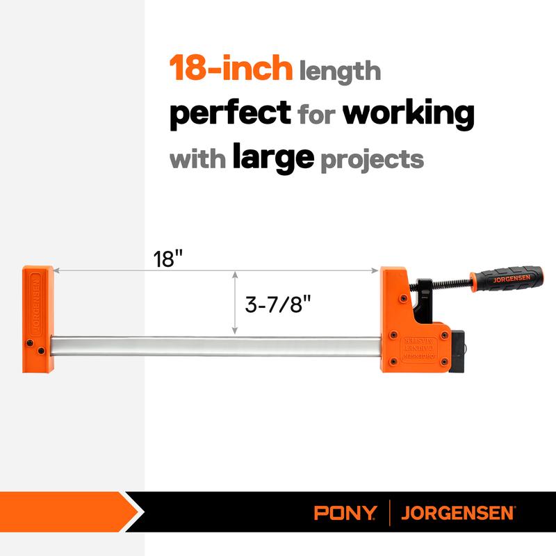 ·𝟏𝟖” 𝐁𝐚𝐫 𝐂𝐥𝐚𝐦𝐩: The throat depth of this parallel clamp is 3-7/8 inch, jaw width is 1-7/8 inch, ensuring a wide enough surface to clamp your workpieces tight and keep them square and free from movement