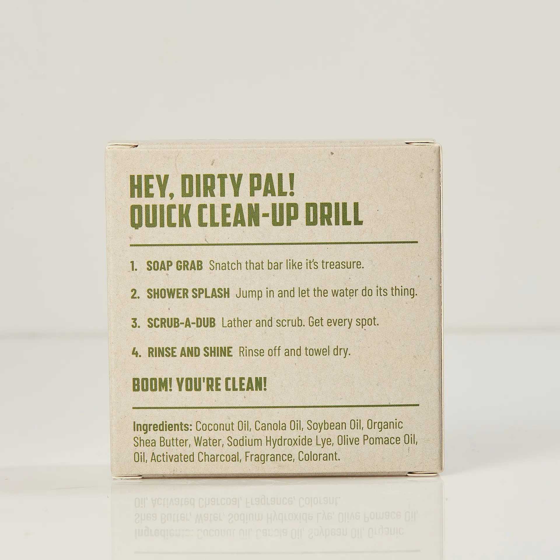 Ingredients: Coconut Oil, Canola Oil, Soybean Oil, Organic Shea Butter, Water, Sodium Hydroxide Lye, Olive Pomace Oil, Oil, Activated Charcoal, Fragrance, Colorant